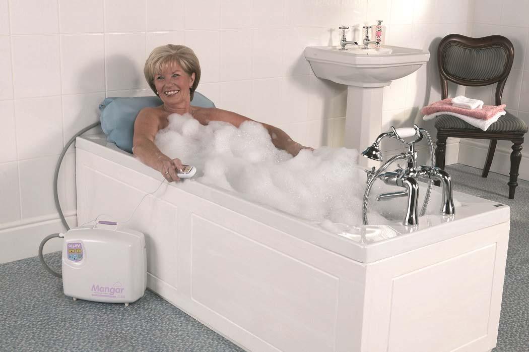 Besitzen Sie eine kurze Badewanne, dann finden Sie mit dem Luftpolster Badekissen Mangar einen Badelift für die Wanne, der Ihnen gewohnt genügend Freiraum beim Baden auch für die Beine bietet. Sie haben Probleme beim Ein- bzw. Ausstieg aus Ihrer Wanne oder dem Hinsetzen und Aufstehen vom Wannenboden? Mangar ist die passende Alternative zu herkömmlichen Badewannenliftern.