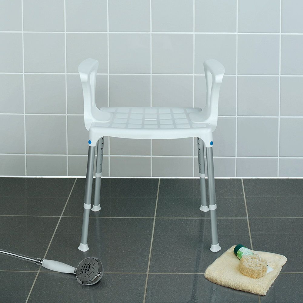 - Hochbelastbar gibt Ihnen die 46,5 cm breite und 30 cm tiefe Sitzfläche zwischen den stützenden Armlehnen die nötige Sicherheit auf dem Duschsitz bei der selbstständigen Hygiene.