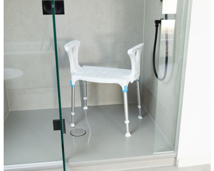 - Wenn Sie den Russka Laguna Duschhocker mit Armlehnen und geschlossener Sitzfläche kaufen, entscheiden Sie sich für einen schmalen Badhocker der Ihnen selbst in kleinen Duschen genügend Freiraum lässt.