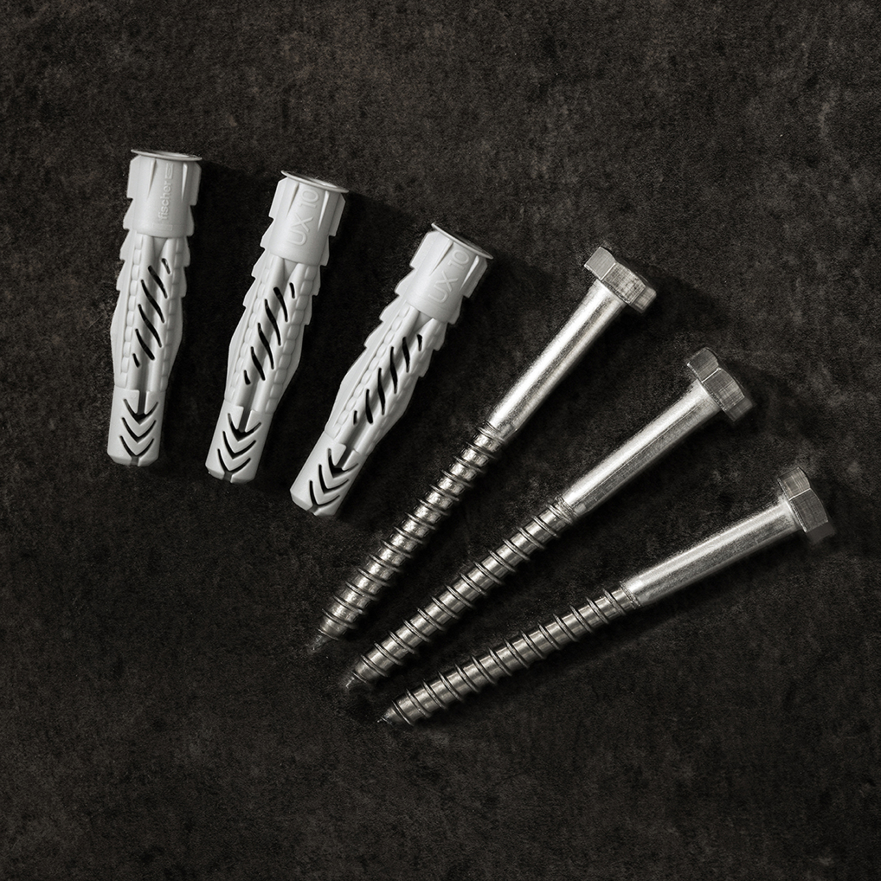 - optional mit Befestigungsmaterial 84006130 erhältlich: 3 Edelstahlschrauben DIN 571 A 8x90 + 3 Fischer Dübel UX R 10