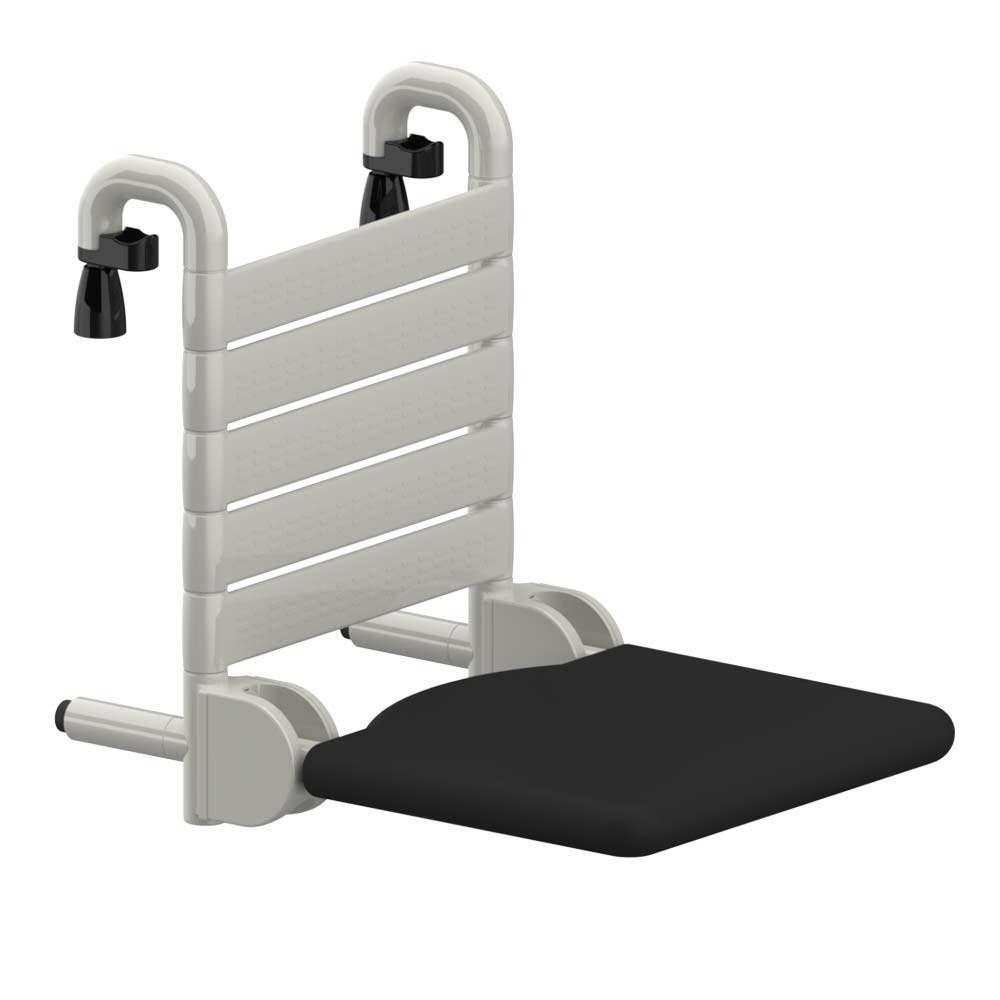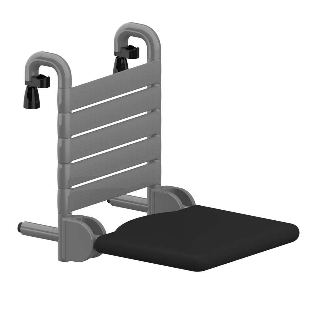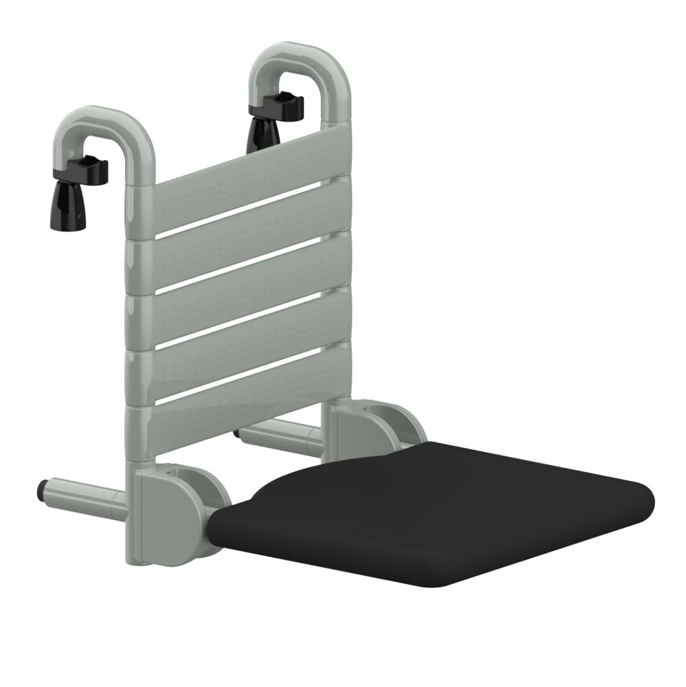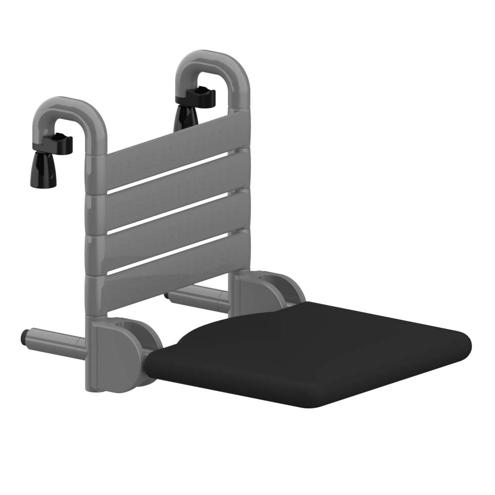 Ein Normbau Einhängesitz aus der Serie Nylon Care 400 besteht aus Polyamid mit korrosionsgeschütztem durchgehenden Stahlkern und einem schwarzen PUR-Polstersitz. Im Gegensatz zu pulverbeschichteten Duschsitzen entscheiden Sie sich hier für einen eleganten, hochklappbaren Klappsitz zum Einhängen an einen an der Wand verschraubten 50 oder 60 cm langen Haltegriff als auch einen Duschhandlauf mit drei Befestigungspunkten.