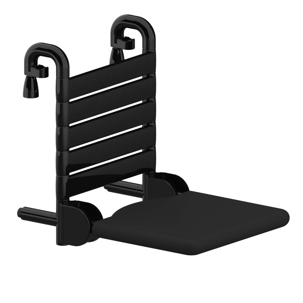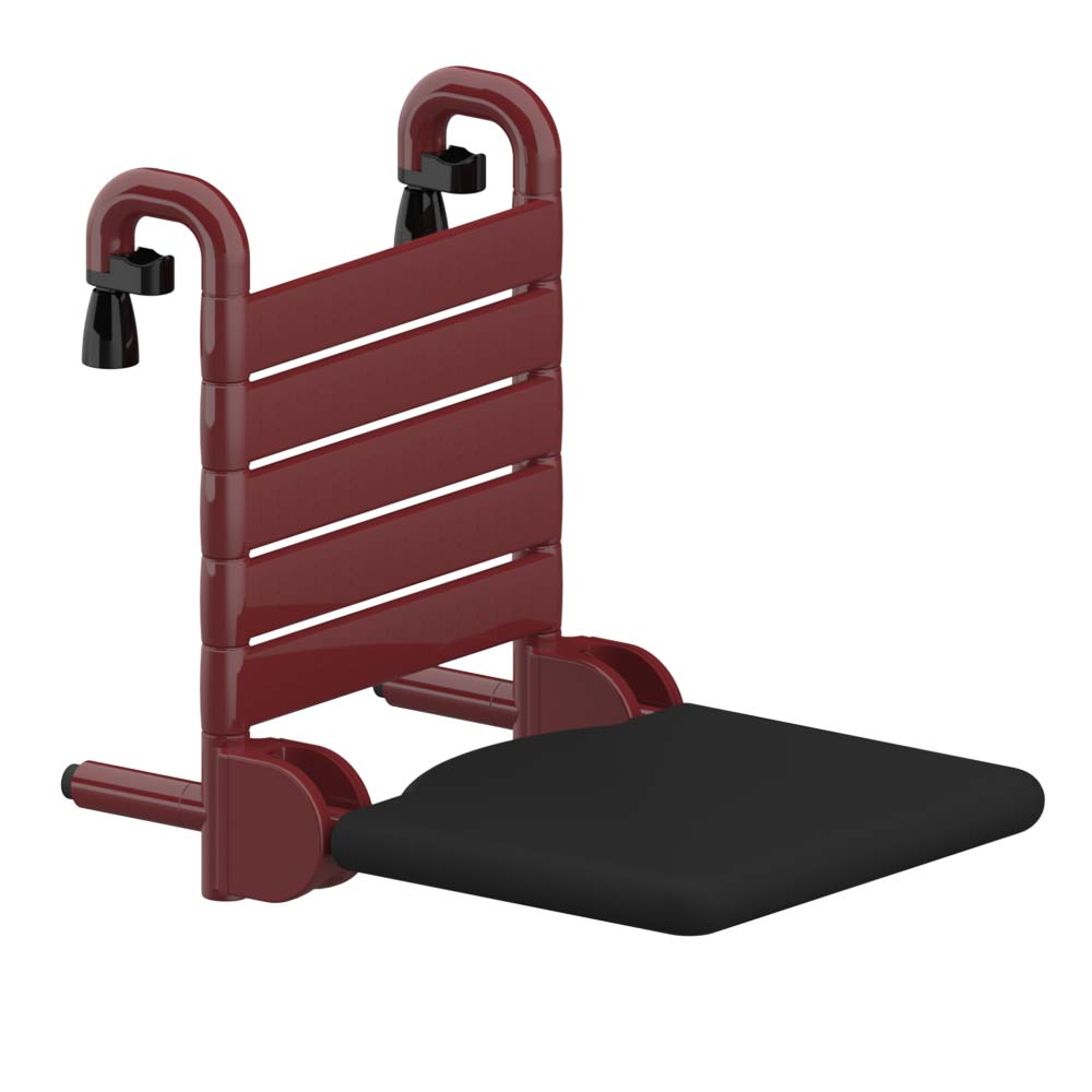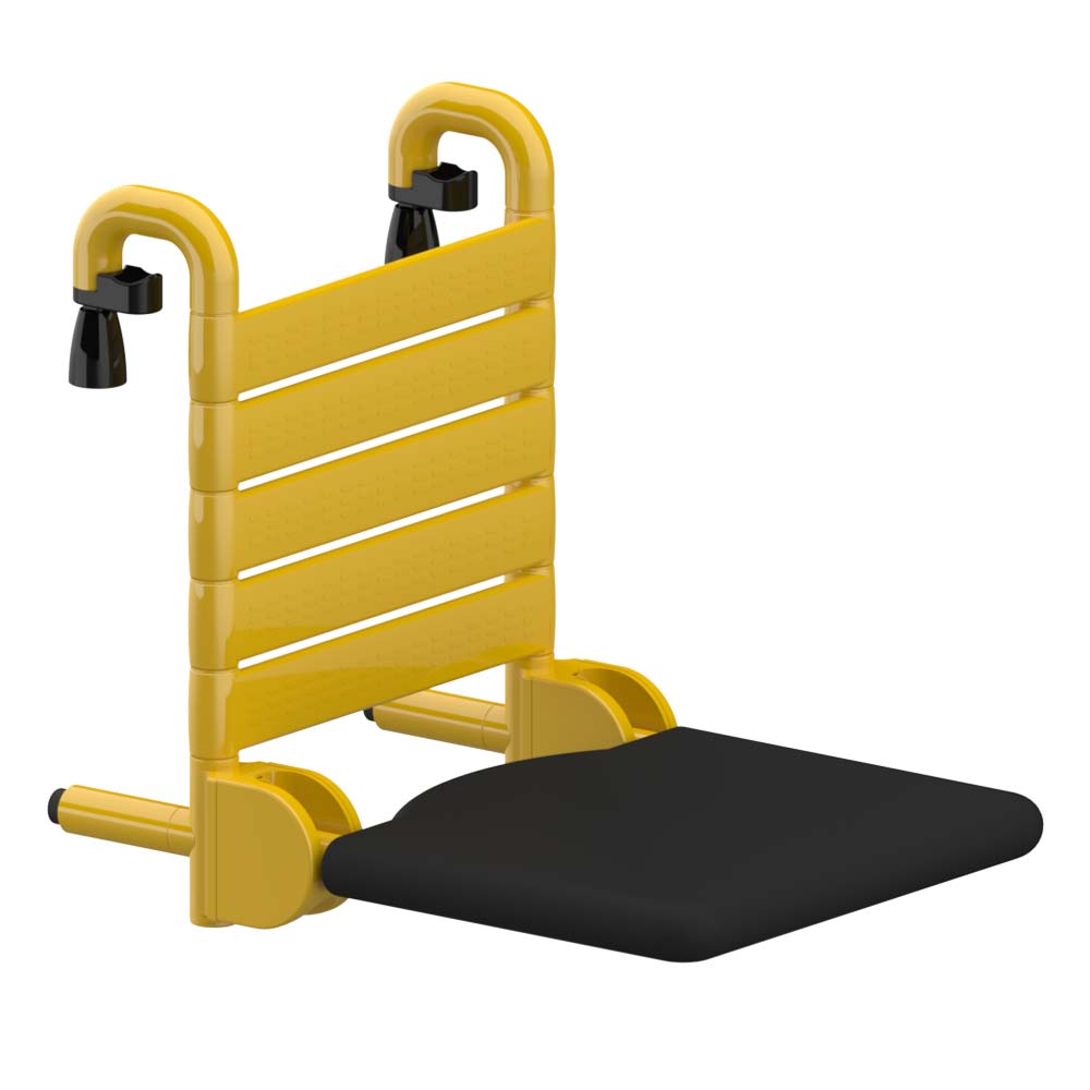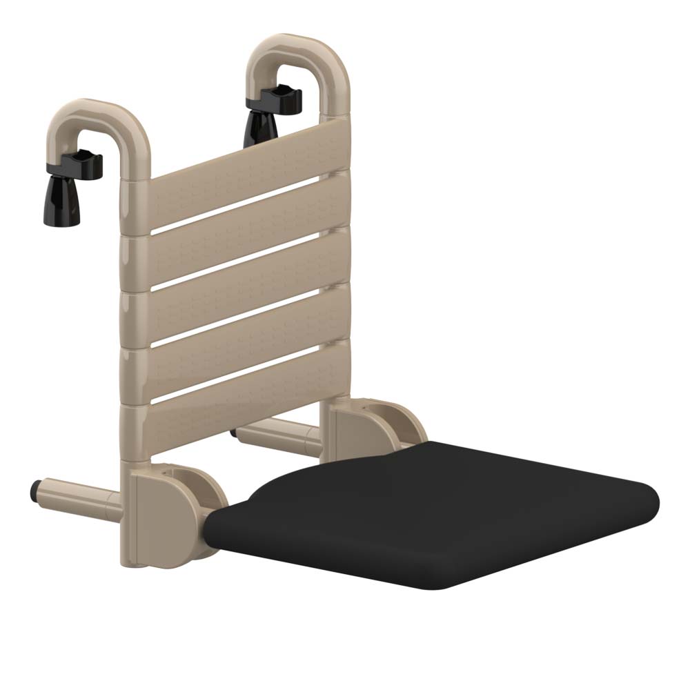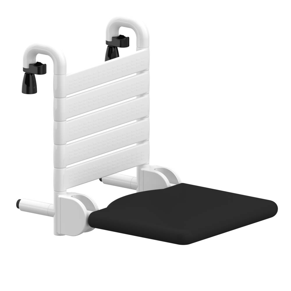 Ein Normbau Einhängesitz aus der Serie Nylon Care 400 besteht aus Polyamid mit korrosionsgeschütztem durchgehenden Stahlkern und einem schwarzen PUR-Polstersitz. Im Gegensatz zu pulverbeschichteten Duschsitzen entscheiden Sie sich hier für einen eleganten, hochklappbaren Klappsitz zum Einhängen an einen an der Wand verschraubten 50 oder 60 cm langen Haltegriff als auch einen Duschhandlauf mit drei Befestigungspunkten.