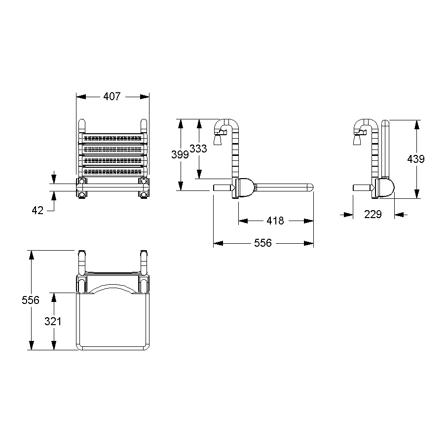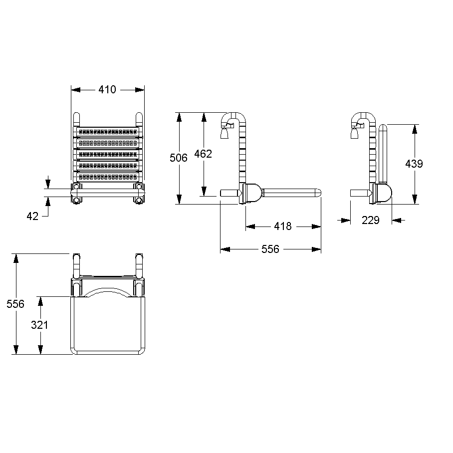 für Duschandlaufoberkante 850 mm entspricht die Sitzhöhe 460 mm (DIN18040 und ÖNORM B1600) - Rückenhöhe ca. 40 cm - 410 x 564 x 397 mm