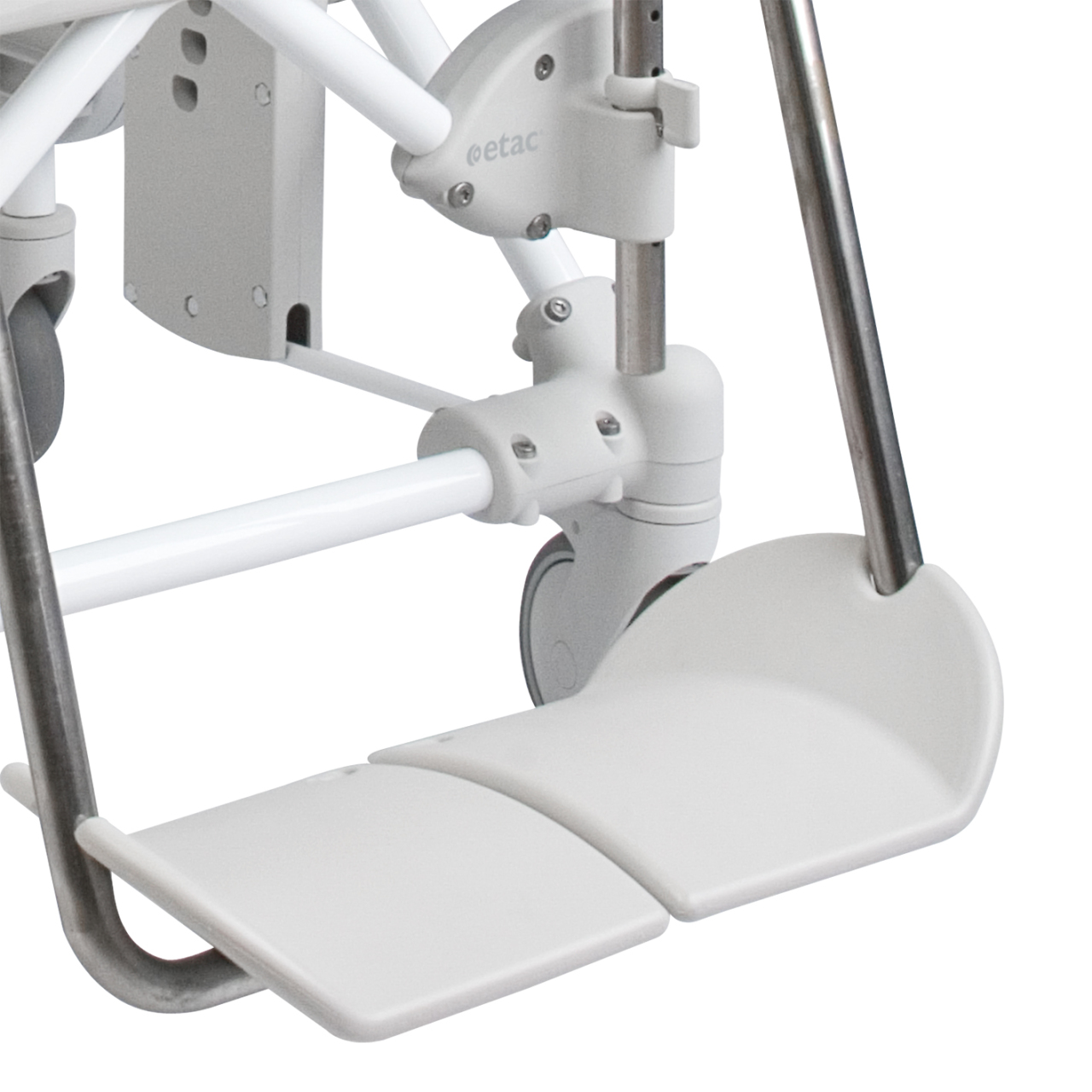 Die hochklappbaren Fußstützen des Toilettenrollstuhls werden gesteckt und sind in der Höhe von 34 bis 46,5 cm einstellbar. Sie verfügen über stabile, sanft gewölbte Fußplatten, die größtmögliche Sicherheit vor Stoßverletzungen im Bad und auf der Toilette bieten.