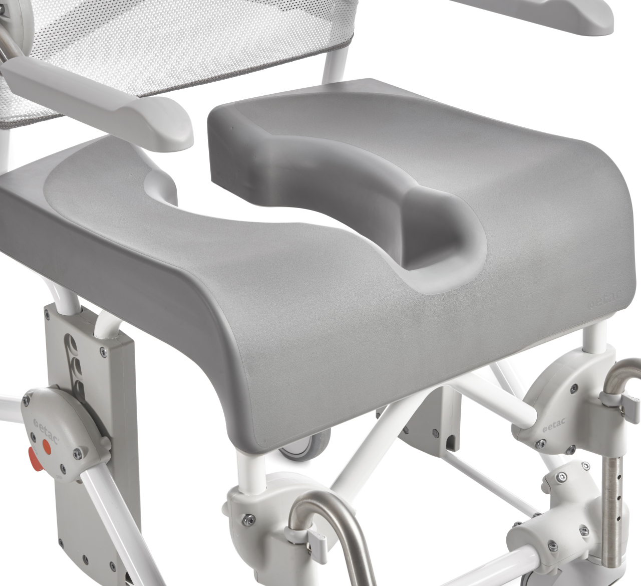 Trotz der Breite der Armlehnen ist das größte Außenmaß des Duschrollstuhl Swift Mobil, auf Höhe der 12,5 cm großen arretierbaren Räder. Dies minimiert für den Nutzer das Risiko, sich beim Fahren Quetschungen zuzuziehen. Die Sitzfläche aus Polypropylen mit seiner 30 x 21 cm großen schlüsselförmigen Hygieneöffnung ist für eine einfache Reinigung abnehmbar. Benötigen Sie eine weiche Sitzfläche, bietet Etac für dieses Modell Sitze in geschlossener oder mit Hygieneaussparung offene Modelle aus Polyurethan an.