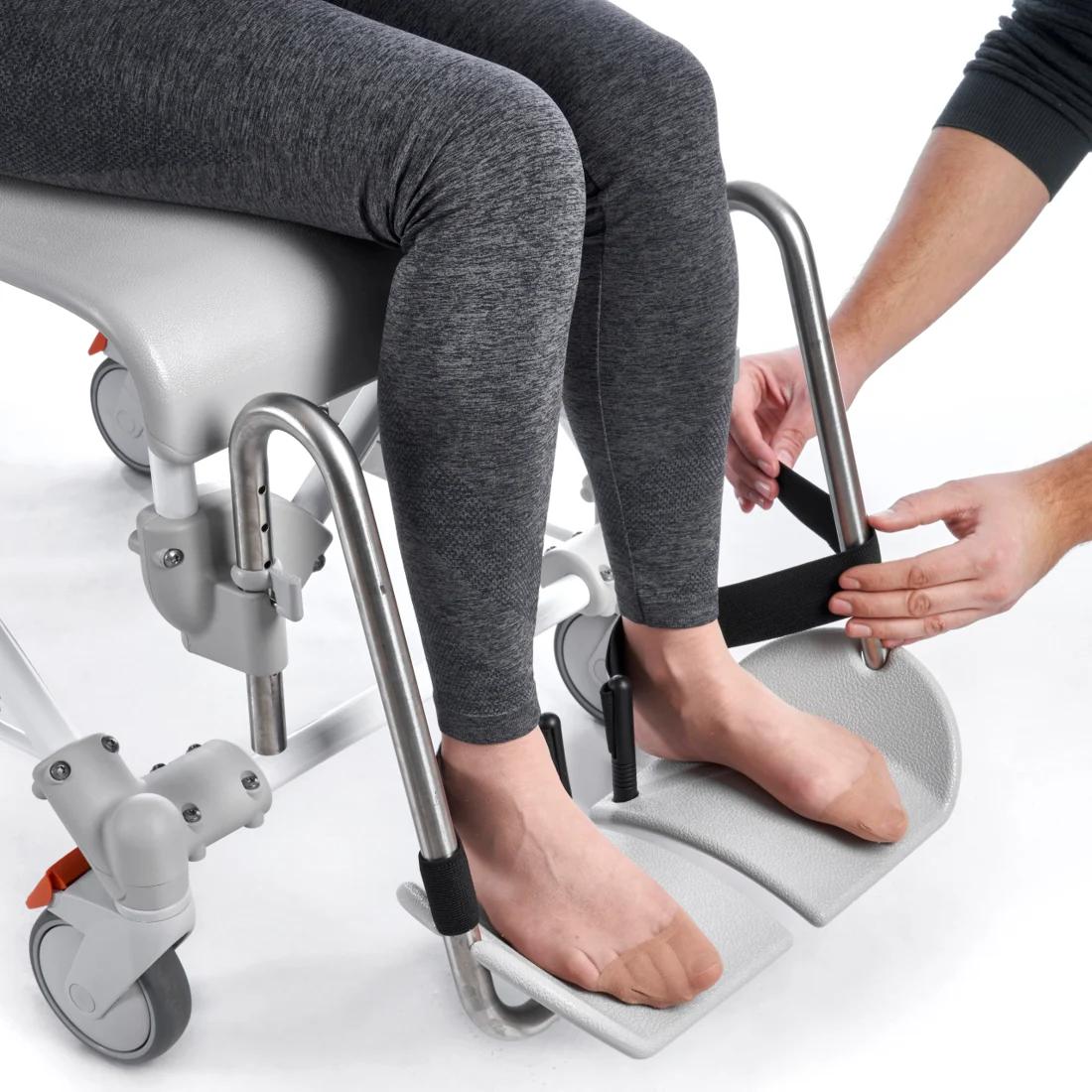 Die Fersenbänder für den Dusch- und Toilettenrollstuhl Etac Swift-Mobil 2 verhindern das Abrutschen der Füße nach hinten. Sie sind in der Länge einstellbar.