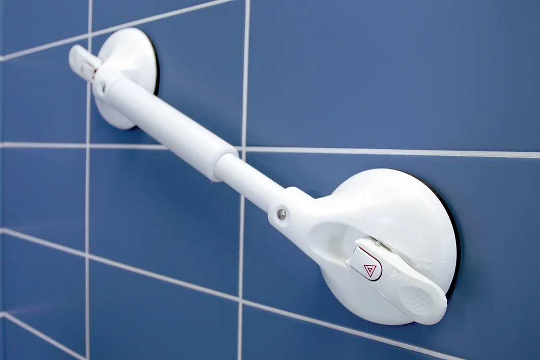 Ob vertikal, diagonal oder waagerecht angebracht, sind die mobilen Roth Teleskop-2-Handgriffe als sichere Saughaltegriffe aus dem Sanitätshaus bis 85 kg hochbelastbar.