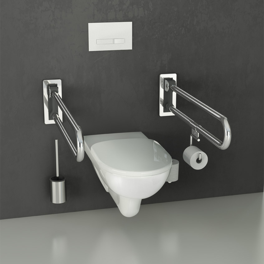 - Ergänzt wird das Programm der Stützgriffe um den Edelstahl Stützklappgriff mit Standsäule, die am Boden montiert werden, um Ihnen das Hinsetzen und Aufstehen von der Toilette erleichtern und so Ihre Eigenständigkeit erhalten.