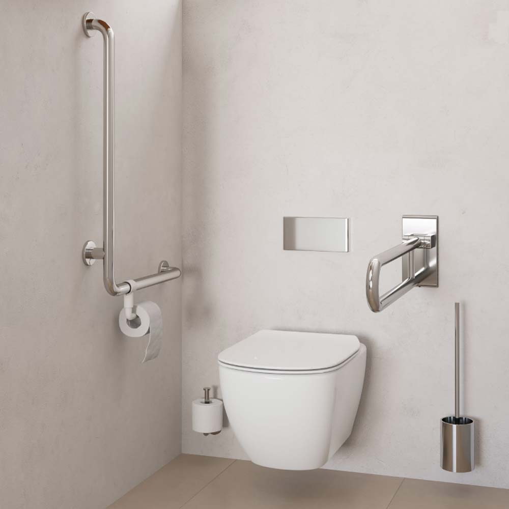 Der Stützklappgriff Inox Care variomit satinierter oder hochglanzpolierter Oberfläche ist inklusive Grundplatte und einem Griffdurchmesser von 32 mm mit verdeckter Verschraubung in den Gesamtlängen 600, 725, 850 oder 900 mm lieferbar. Belastbar bis 125 kg sorgt der schmal hochklappbare Haltegriff als TÜV geprüftes Hilfsmittel für den sicheren Halt zum Aufstützen beim eigenständigen Toilettengang. Die Ausstattungsserie Inox Care umfasst neben dem Stützklappgriff eine Vielzahl an Hilfsmitteln, um ein barrierefreies Badezimmer im zeitlosen, klaren Design bei hoher Funktionalität auszustatten.