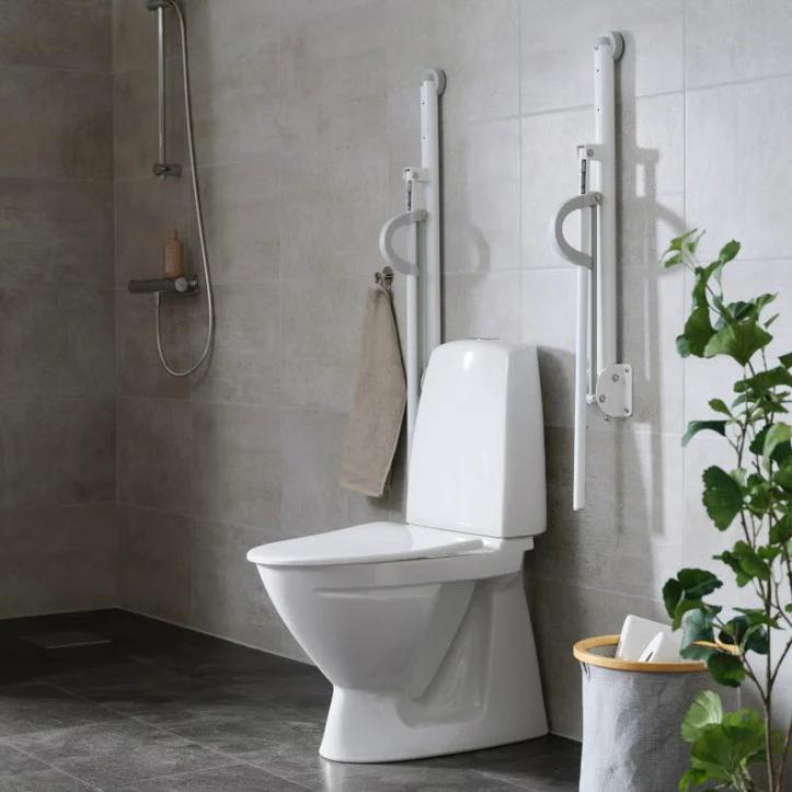 Die Bad Haltegriffe für die Toilette lassen sich platzsparend unten an den Stützen leicht wieder ein- und ausklappen.