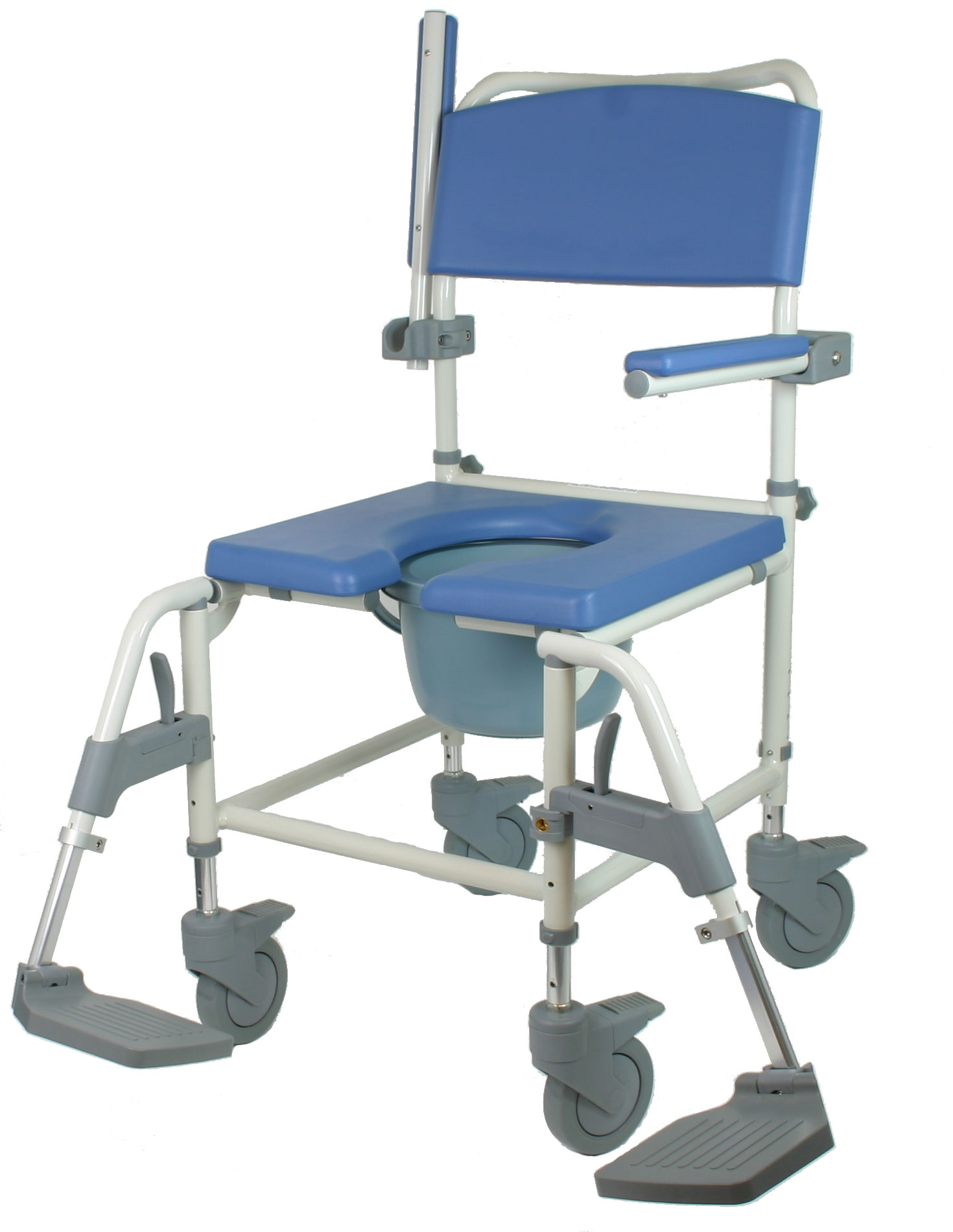 Die nach vorne hin offene softige Sitzbrille, die Rücken- und die nach oben hin schwenkbaren Armlehnen des Duschrollstuhl Aston bestehen aus blauem weichem PUR. Die hochklappbaren Armlehnen erleichtern bei Bewegungseinschränkung den Transfer auf und vom Toilettenrollstuhl Aston.