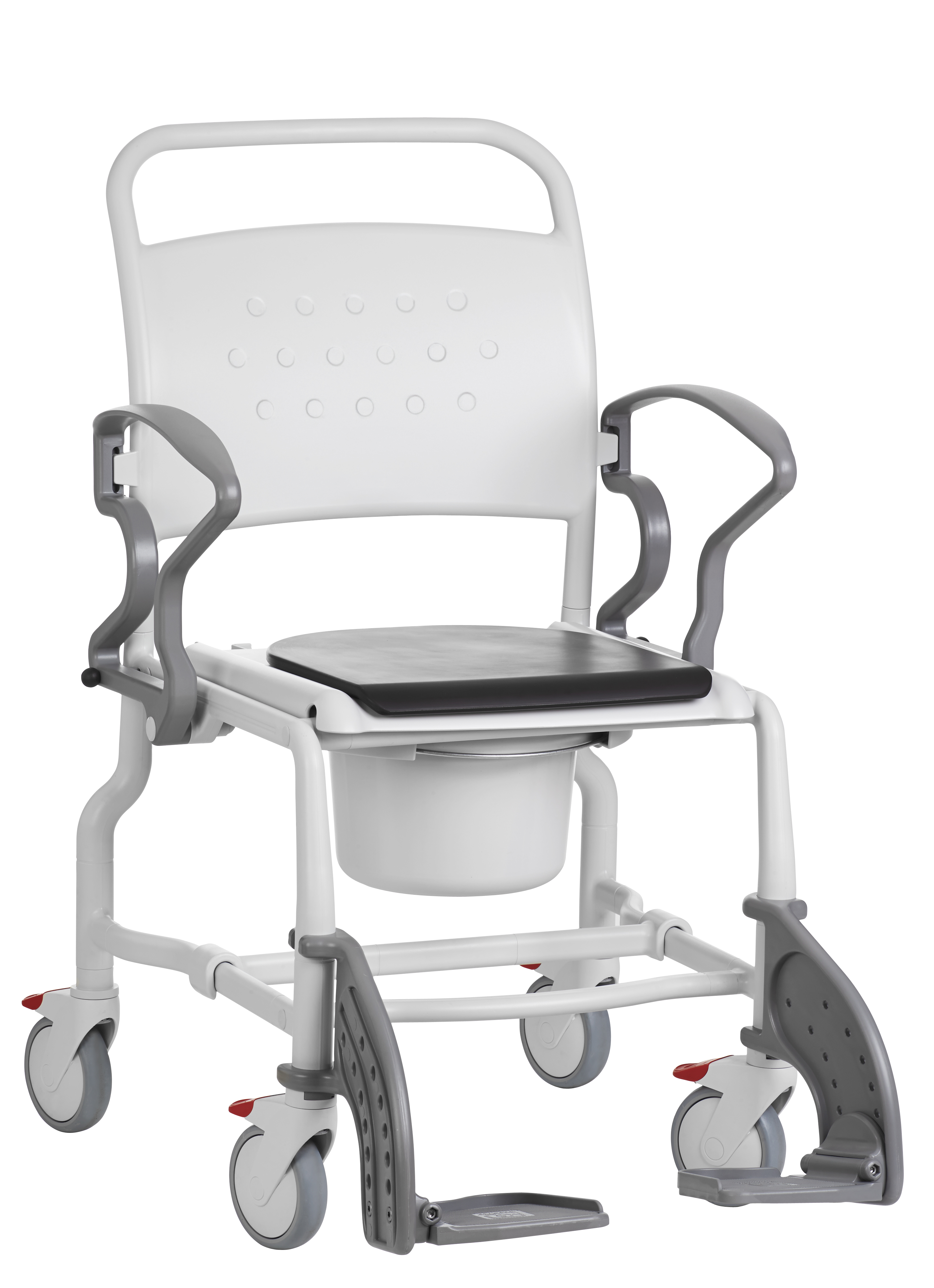 - 5-Zoll Schwenkräder machen den Toilettenrollstuhl Bonn besonders wendig.