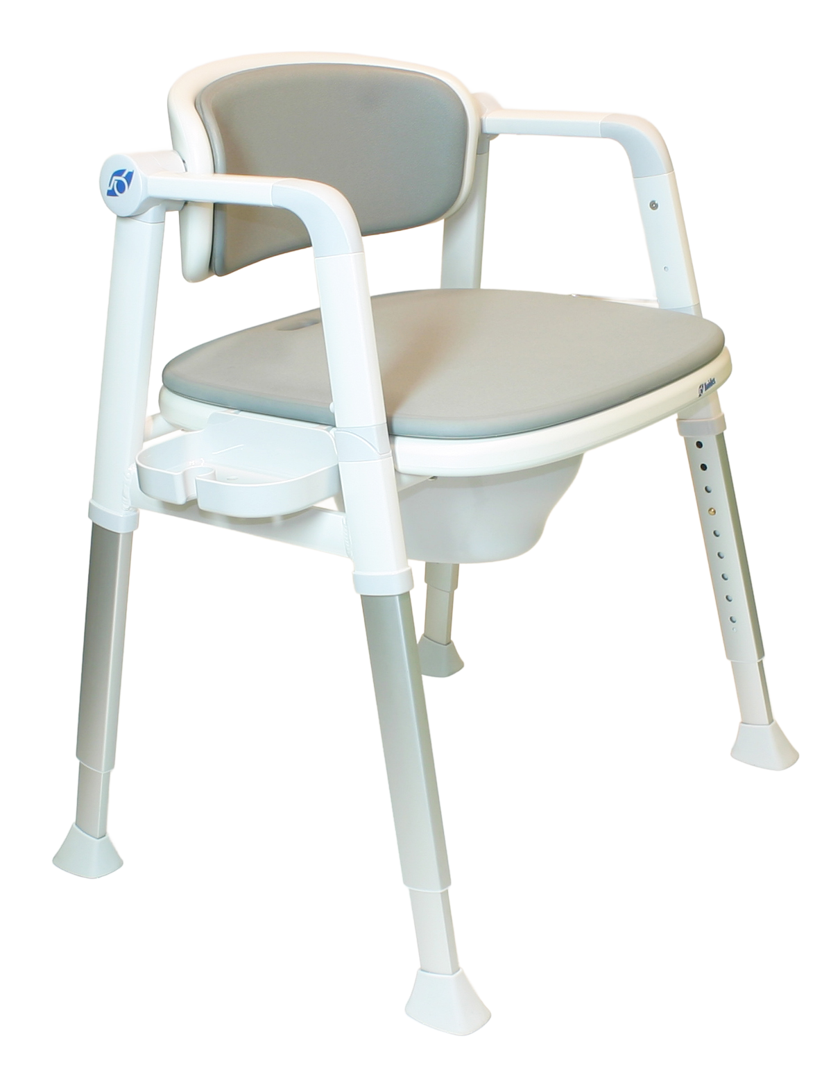 - Toilettenstuhl inklusive Toiletteneimer mit Deckel, Sitz- und Rückenpolster, kleines Seitentablett, Toilettenpapierhalter