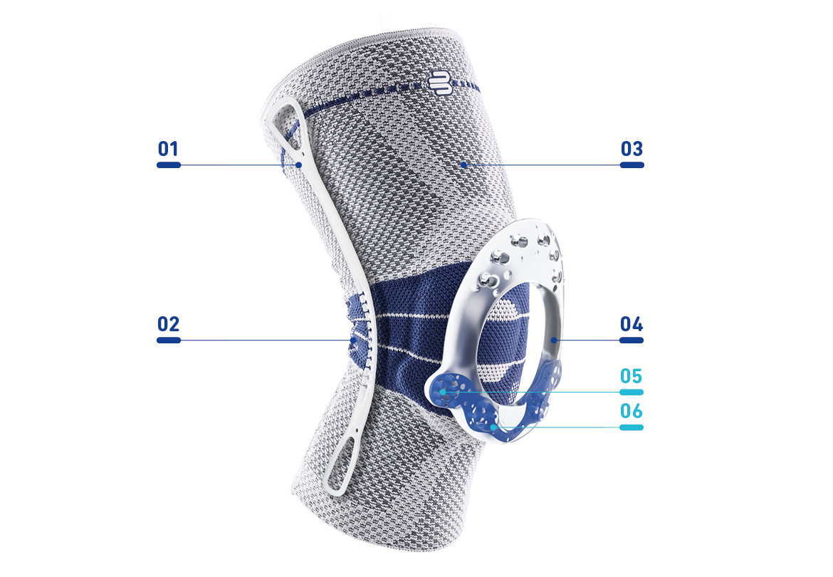 Das Bandagengestrick der hochwertigen Bauerfeind Genutrain Comfort aus dem Online Sanitätshaus in der Farbe titan oder schwarz ist der Körperform angepasst und mit einem eingearbeiteten, ringförmigen Funktionspolster, der Omega-Pelotte, ausgepolstert.
