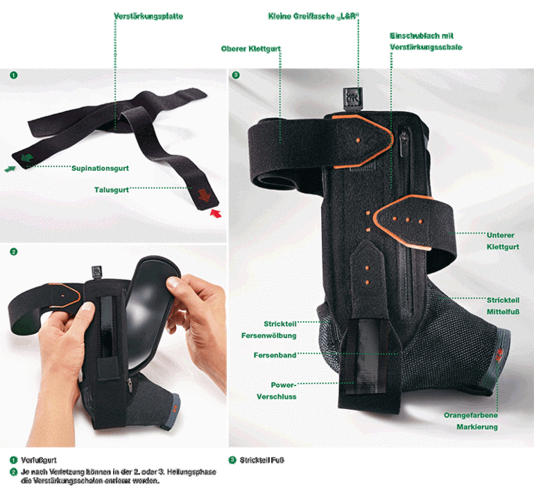 - in der Akutphase der Distorsion kommen das Strickteil, die Verstärkungsschalen auf beiden Seiten zum Einsatz