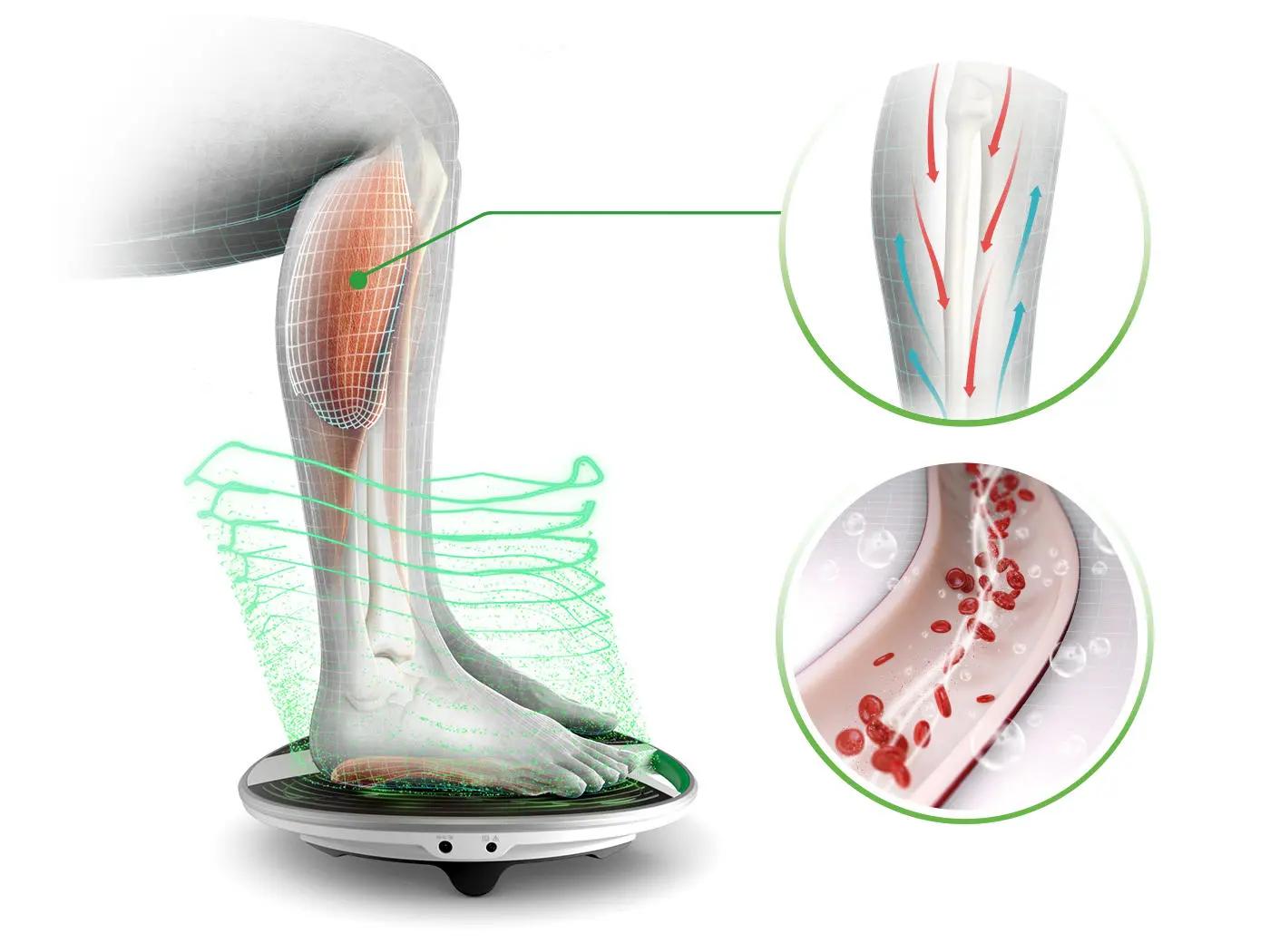 15 verschiedene therapeutische elektrische Impulsvarianten stimulieren die Nervenenden an den Fußsohlen, wenn man die bloßen Füße auf den Fuß-Pads platziert. Dies verursacht ein Zusammenziehen und Entspannen der Unterschenkelmuskeln. Dieser Vorgang verbessert klinisch nachgewiesen die Durchblutung.