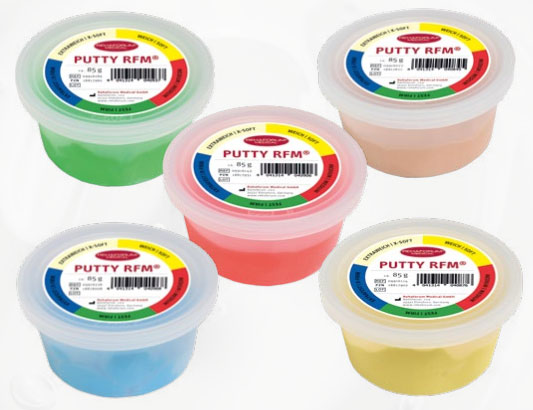 Putty RFM ist in verschiedenen Farben/Härtegraden erhältlich. Die Therapieknete Putty RFM färbt nicht ab, ist geruchsneutral und lässt sich rückstandslos entfernen.