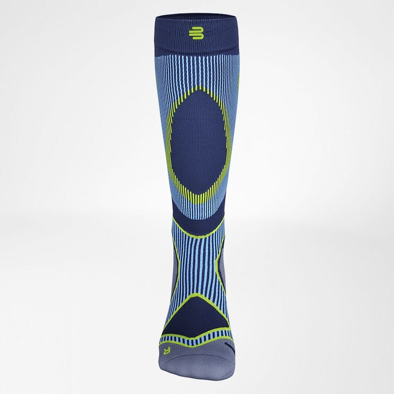 Bauerfeind Men Run Performance Compression Socks für Herren in modernen sportlichen Farben sind paarweise erhältlich, strapazierfähig, atmungsaktiv und sitzen sicher durch das Silikonhaftband am oberen Abschluss.