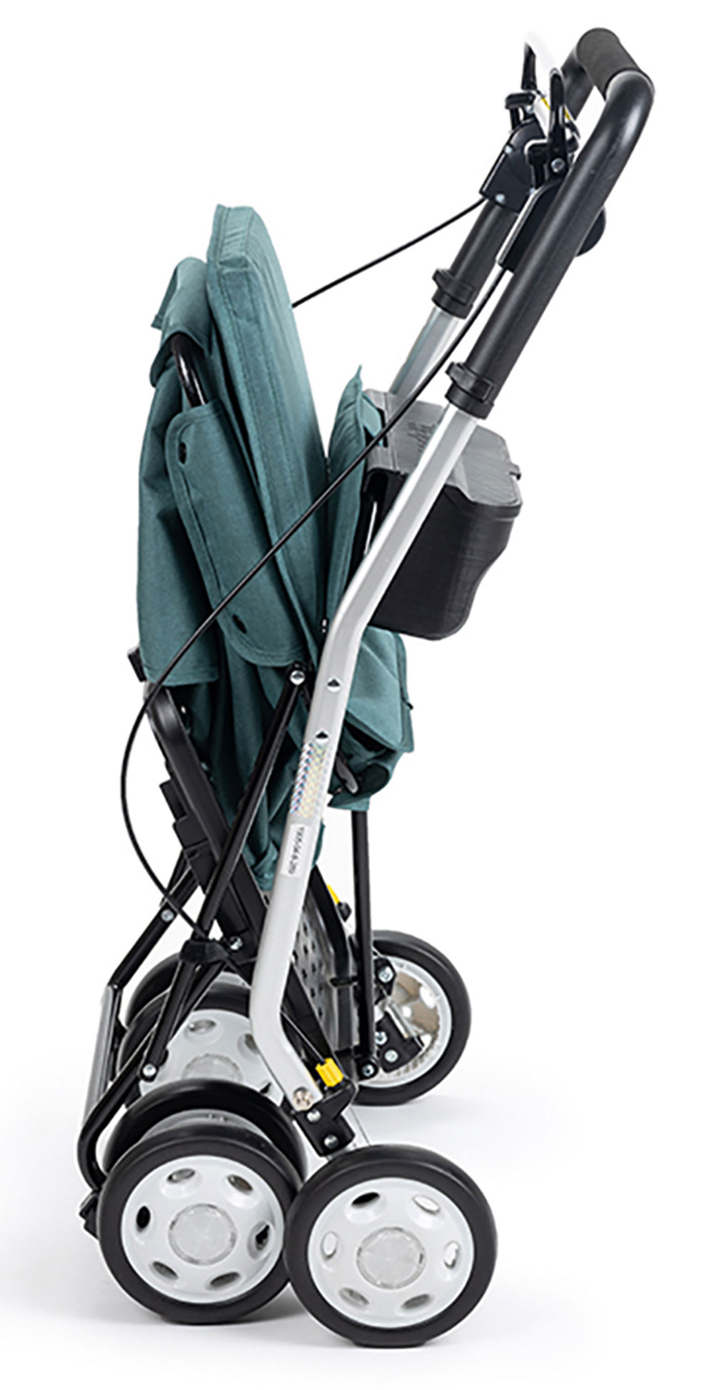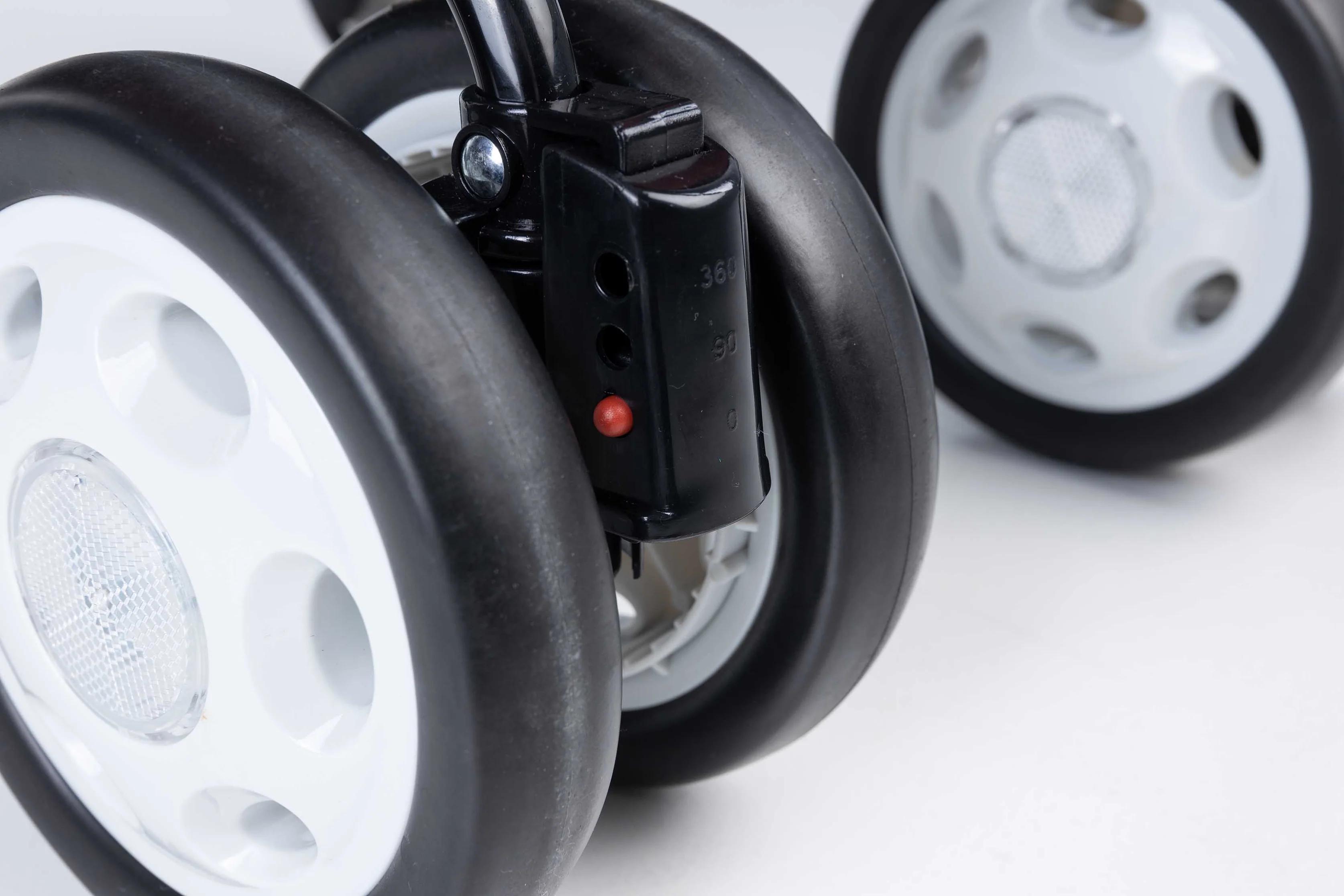 Seine wendige Doppelbereifung vorne sorgt für Flexibilität in engen Gängen im Supermarkt. Die leisen Räder aus EVA lassen sich vorne bei Bedarf in der Richtung auch feststellen, auf 90° Drehung oder auf 360° Drehung einstellen.