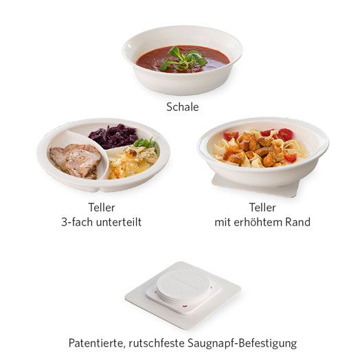Das praktische Teller-Set mit Saugnapf-Befestigung besteht aus einem Teller mit erhöhtem Rand, einem 3-fach unterteilten Teller, einer Schale und einer rutschfesten Saugnapf-Befestigung. Gerade bei eingeschränkter Handbeweglichkeit ist das Teller-Set eine hilfreiche Unterstützung.