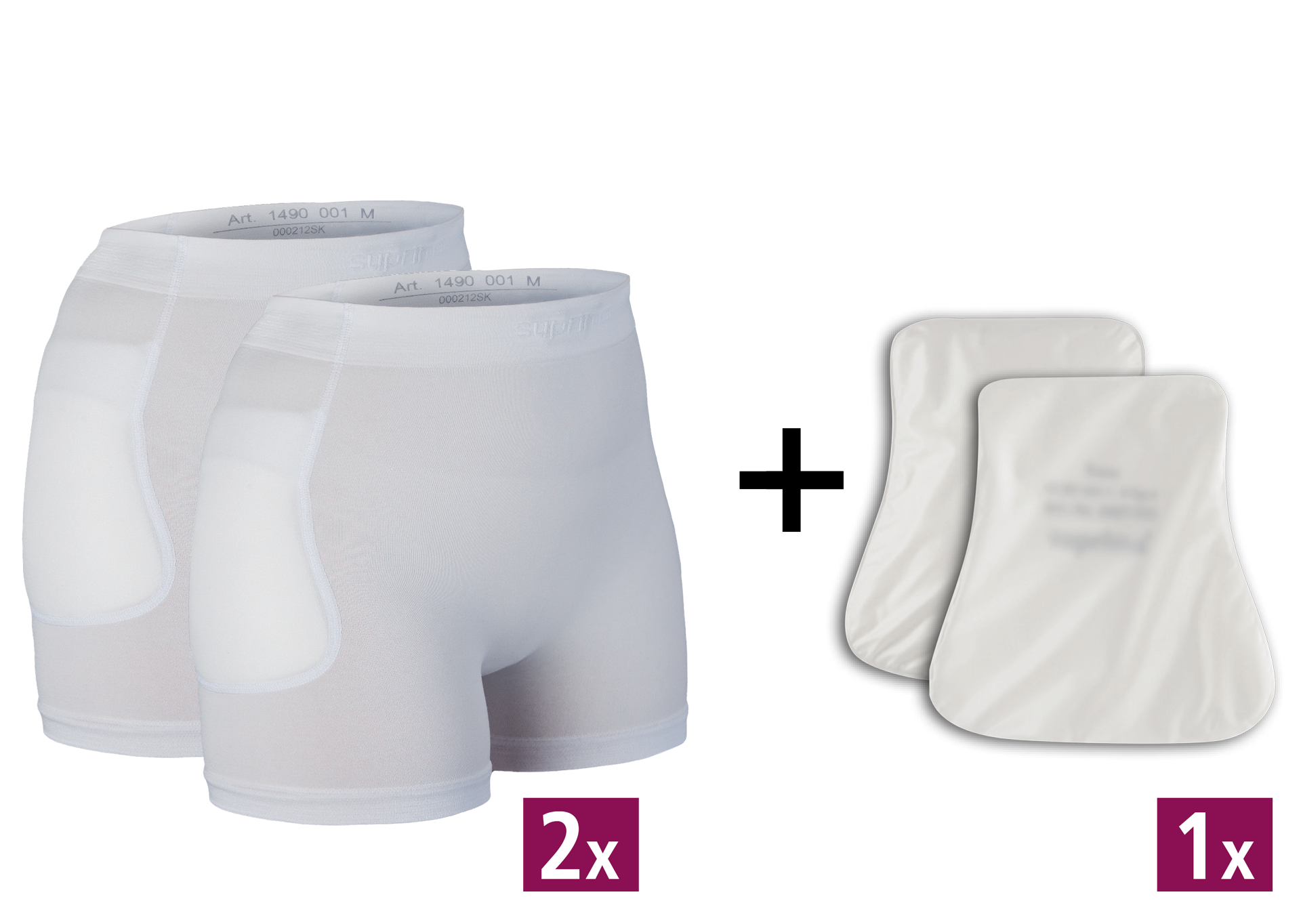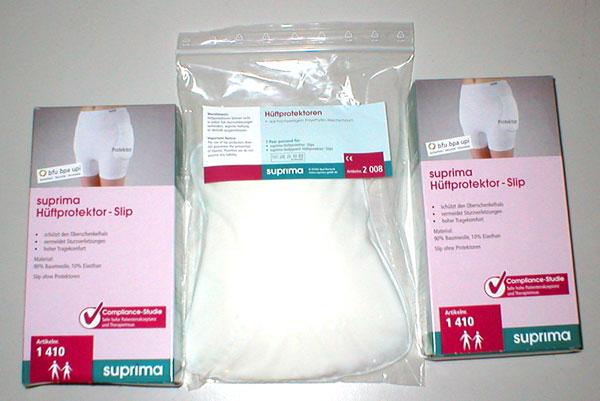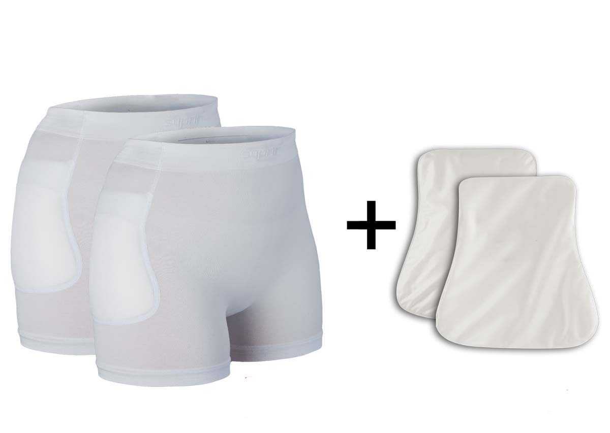 Das Hüftprotektorset Suprima enthält 2 Hüftprotektoren-Slips und 1 Paar Hüftprotektoren, die Brüchen bei Sturz vorbeugen.