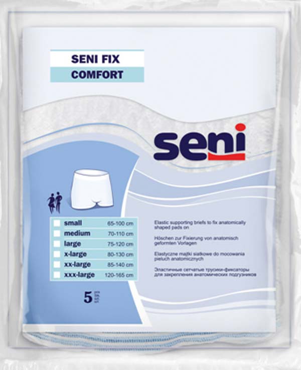 Die elastischen SeniFixComfortNetzhosen mit optimaler Anpassung an den Körper zur Fixierung von anatomisch geformten Vorlagen zum mehrmaligen Gebrauch sind bei 60° C waschbar. Die Nähte sind auf der Außenseite angebracht um die Haut vor Reizungen und Schürfwunden zu schützen. Der höhere Taillenschnitt erlaubt eine noch bessere Fixierung von großen Urineinlagen. Die Manschetten aus Microfaser verhindern den Druck auf die Oberschenkel.