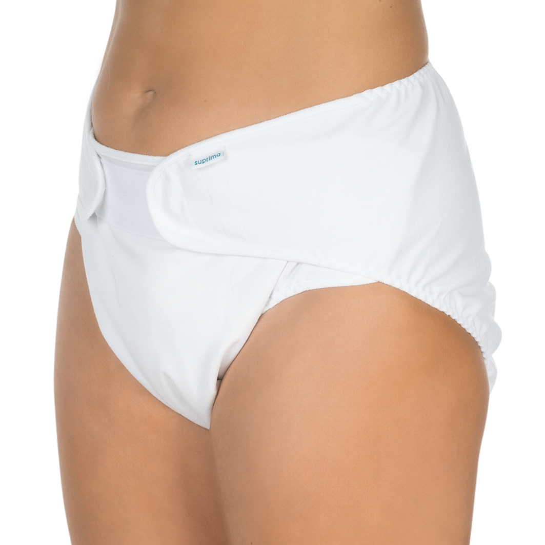 Der waschbare Suprima Inkontinenz Windel-Slip zur Fixierung von Einwegmaterial für Damen und Herren bietet durch die individuelle Größenanpassung über Klettverschlüsse zuverlässigen Auslaufschutz bei schwerer Harn- und Stuhlinkontinenz während der Pflege inkontinenter Personen. Besonders hautfreundlich aufgrund der verwendeten Baumwolle lässt der Suprima Windel-Slip mit Klettverschluss gerade bei bettlägrigen Personen ein leichteres Anziehen zu.