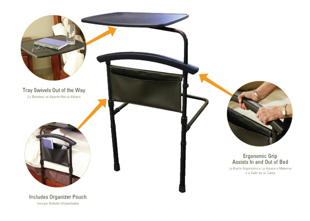 - Verstauen Sie in Greifnähe in der serienmäßg mitgelieferten Seitentasche des IBT Bettgriffes mit Tablett Ihre Utensilien wie ein Buch, die Fernbedienung oder die Brille.