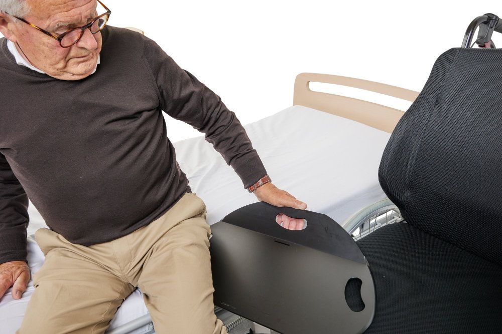 - Das Transferbrett Master Glide hat drei Griffe und die Unterseite ist mit einer rutschfesten Oberfläche versehen, um das Rutschbrett von Master Care stabil zu halten.