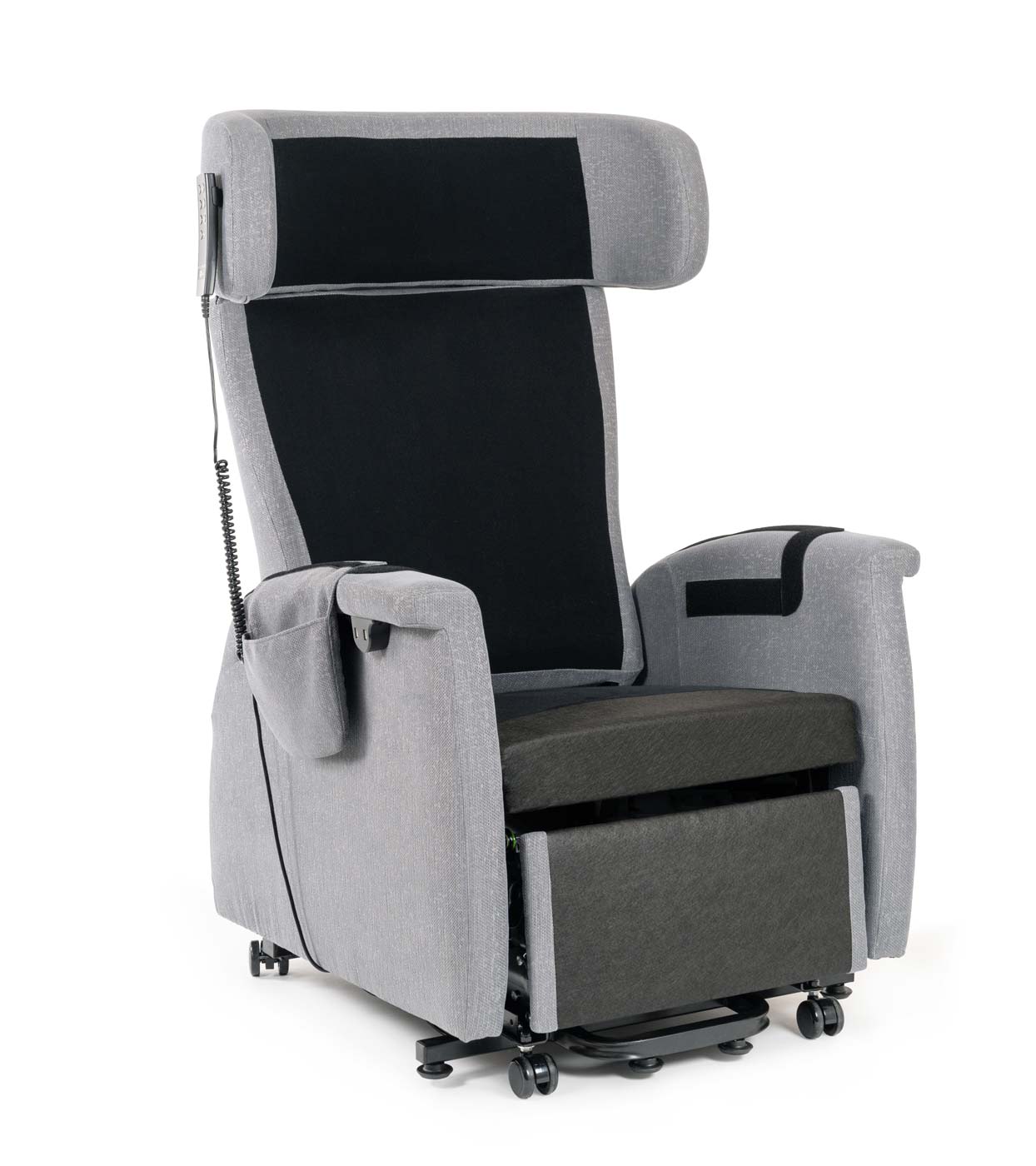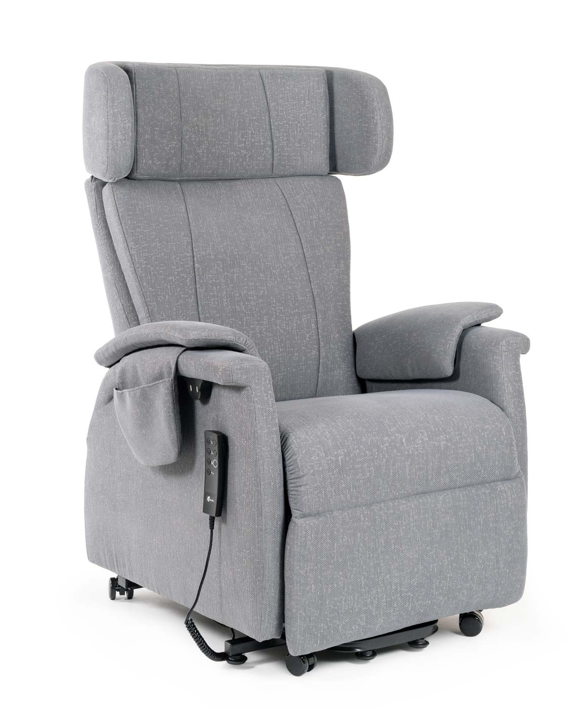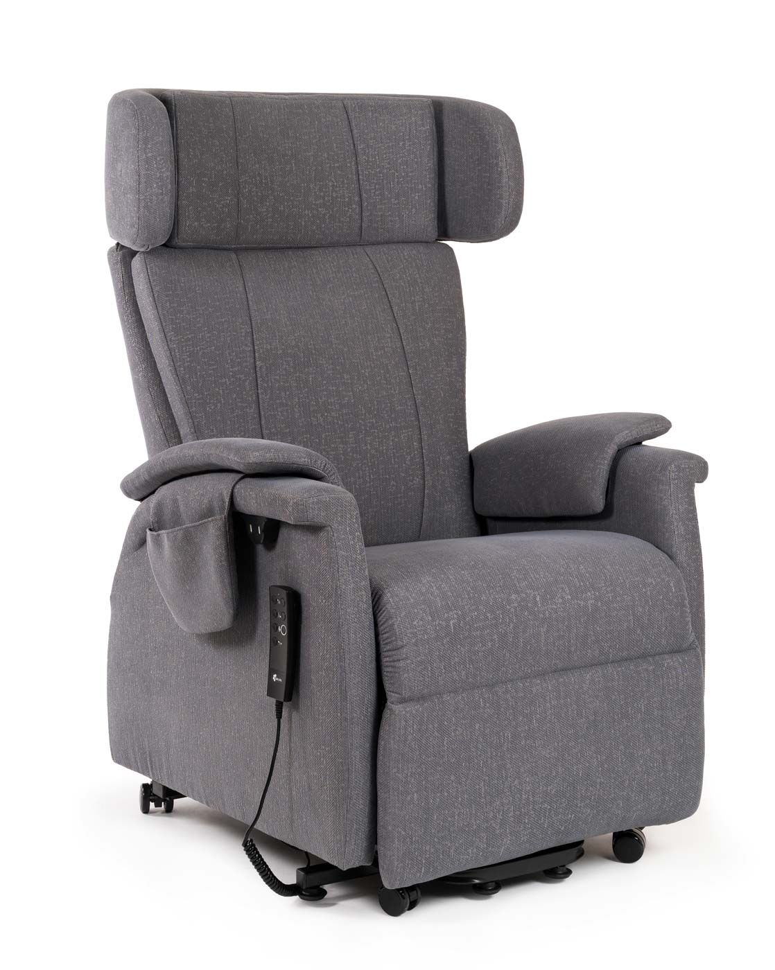 Der Saljol Relax- und Aufstehsessel mit einstellbarer Kopfstütze ist mit festem Polster in Sitzbreite 47 cm oder softig weicher Polsterung in Sitzbreite 42 cm verfügbar und für Nutzer mit einer Körpergröße von 1,60 bis 1,90 m geeignet. Mit der magnetischen Fernbedienung, die mit einem wiederaufladbaren Akku für ca. 30 Schaltzyklen ausgestattet ist, lässt sich der gewünschte Sitz- und Liegekomfort einfach einstellen. Ausgerüstet mit elektrisch verstellbarer Rückenlehne mit Lordosenstütze und Fußstütze, zwei USB-Anschlüssen und Rollen zum Verschieben sichert ein Saljol Aufstehsessel den Erhalt Ihrer Eigenständigkeit.