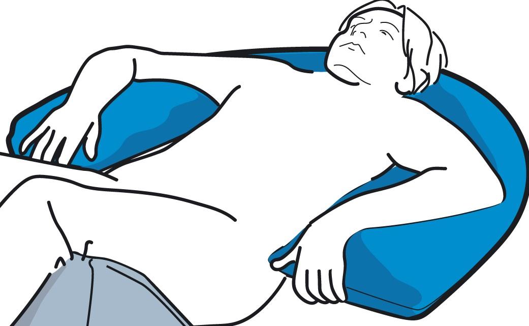 - In stützender Rückenlage des Patienten, zur Fixierung und Druckentlastung, hier wird das Halbmondkissen M direkt unter dem Kopf, Hals, Schultern und den oberen Extremitäten platziert