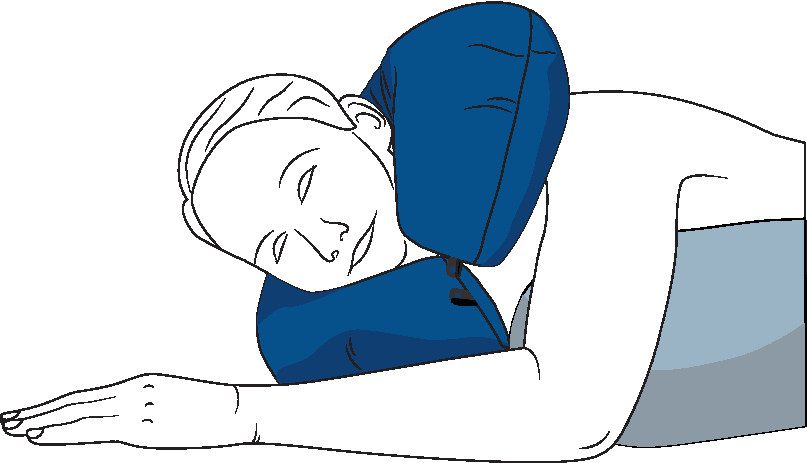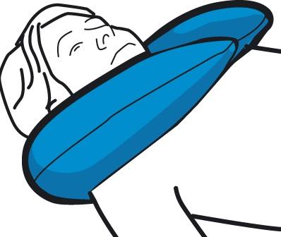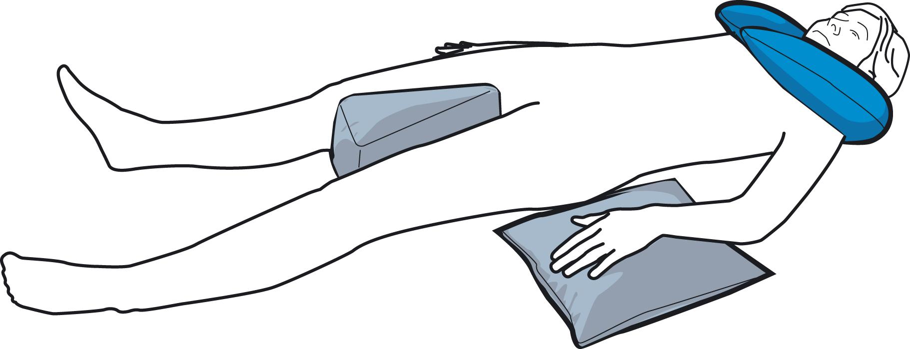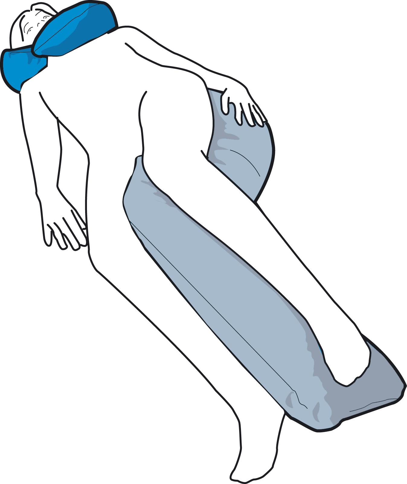 - Ebenfalls kann es zur Unterfütterung der Unterschenkel und Freilagerung der Fersen oder bei der Platzierung unter den Oberschenkeln mit der offenen Seite des Lagerungskissens in Richtung Kopf zur Entlastung des Sakralbereiches durch partielle Freilagerung angewendet werden.