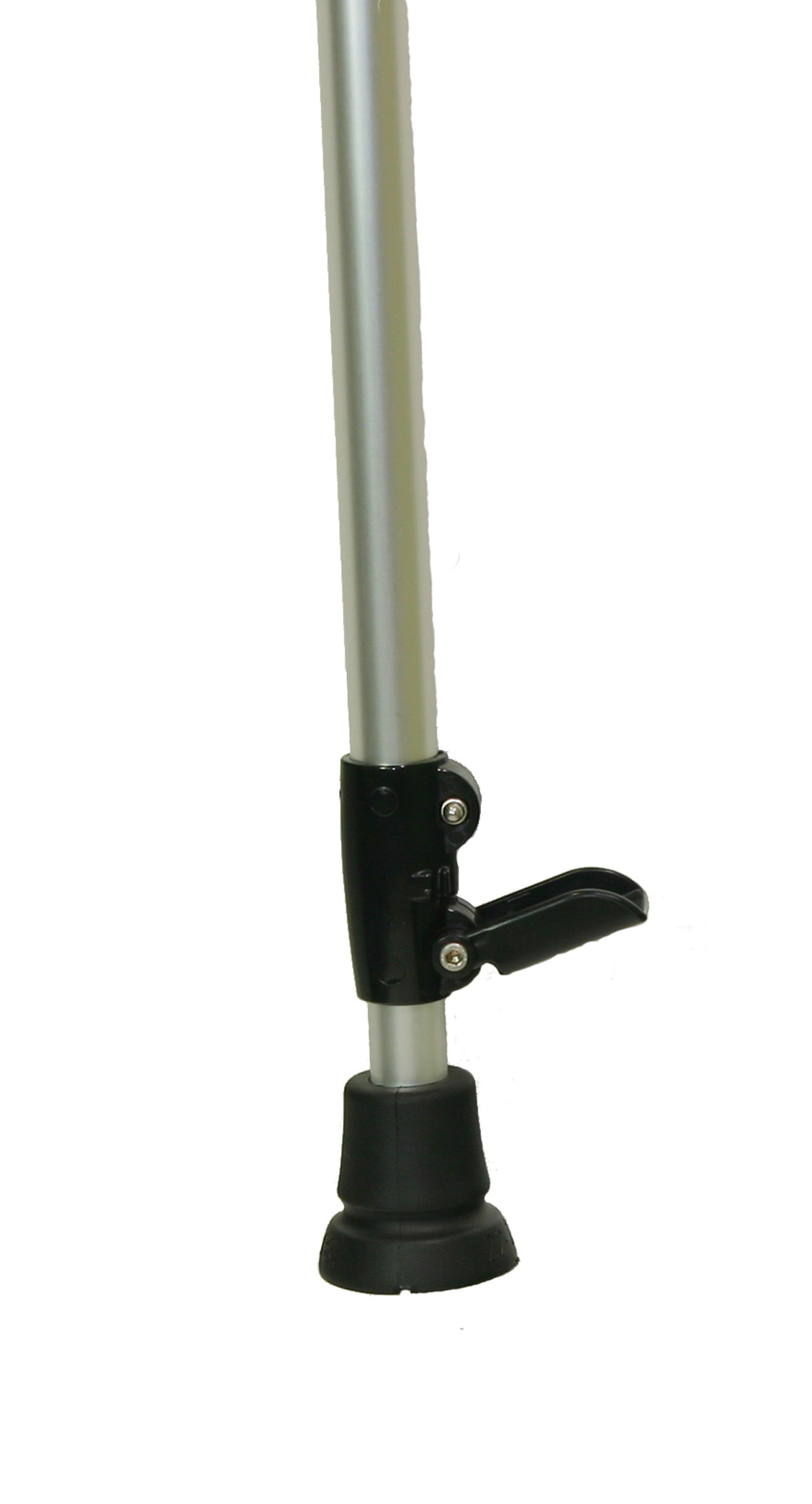 Die Höhe der Armschale lässt sich über einen Druckknopf einstellen. Damit die gewählte Griffhöhe aufgrund der hohen Belastung eingestellt bleibt, befindet sich eine Sicherung am unteren Ende, die Sie mit einem Inbusschlüssel lösen und nach Einstellung wieder festdrehen müssen.