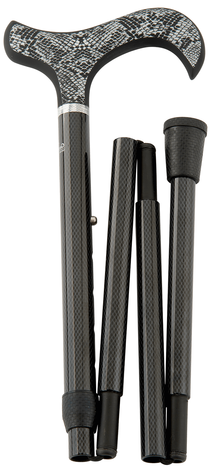 Der schlanke Damen Carbon-Schlank-Faltstock Exotic mit samtigen Soft-profilbeschichtetem DERBY-Griff in Schlangenhautdruck ist ein leichter Handstock aus Carbon. Als faltbarer Gehstock mit einem Eigengewicht von 260 g ist die Gehhilfe bis 100 kg belastbar. Der höhenverstellbare Schuss des faltbaren Gehstockes in Carbon Optik mit Glanz Finish lässt sich in der Griffhöhe von 84 bis 94 cm in 5 Stufen über Druckknopf einstellen.
