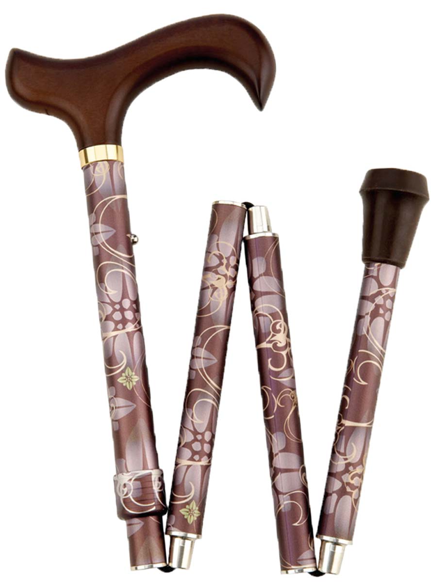 Der Gastrock Damen Deluxe-Faltstock Fantasie mit Derbygriff aus Hartholz zeichnet sich durch seine hochwertige verarbeitete Aluminium-Qualität aus. Der 4-teilige faltbare Gehstock für Damen lässt sich als Gehhilfe in der Griffhöhe von 76 bis 86 cm in 5 Stufen über Druckknopf einstellen und lässt Sie wieder sicher bei Gangstörungen unterwegs sein. Sein höhenverstellbarer Schuss mit Ornamentdekor in Satin Finish ist oben mit einem Messingring und unten mit Gummipuffer mit Stahleinlage ausgerüstet. Damit der Handstock platzsparend bei Nichtgebrauch verstaut werden kann, erhalten Sie den faltbaren Gehstock Fantasie gleich mit Halteklammer und Klarsichtetui.