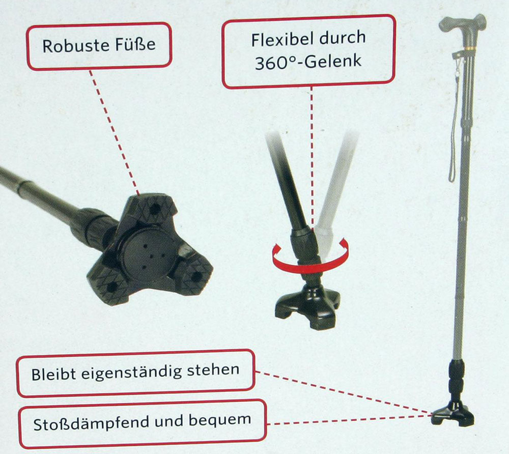 Die Gehstockspitze mit Gelenk und Federung erhöht den Komfort und die Sicherheit beim Gehen mit Ihrer Gehhilfe selbst auf hartem oder unebenem Untergrund. Sie ist stoßdämpfend und durch das 360°-Gelenk flexibel in alle Richtungen. Die drei robusten Füße verleihen Ihnen Sicherheit beim Gehen und bieten zudem den Vorteil, dass Ihre Gehhilfe auf geradem Untergrund eigenständig stehen bleibt. Die beiden mitgelieferten Befestigungen ermöglichen die Montage für Gehhilfen mit einem Durchmesser von 16 mm bzw. 19 mm.