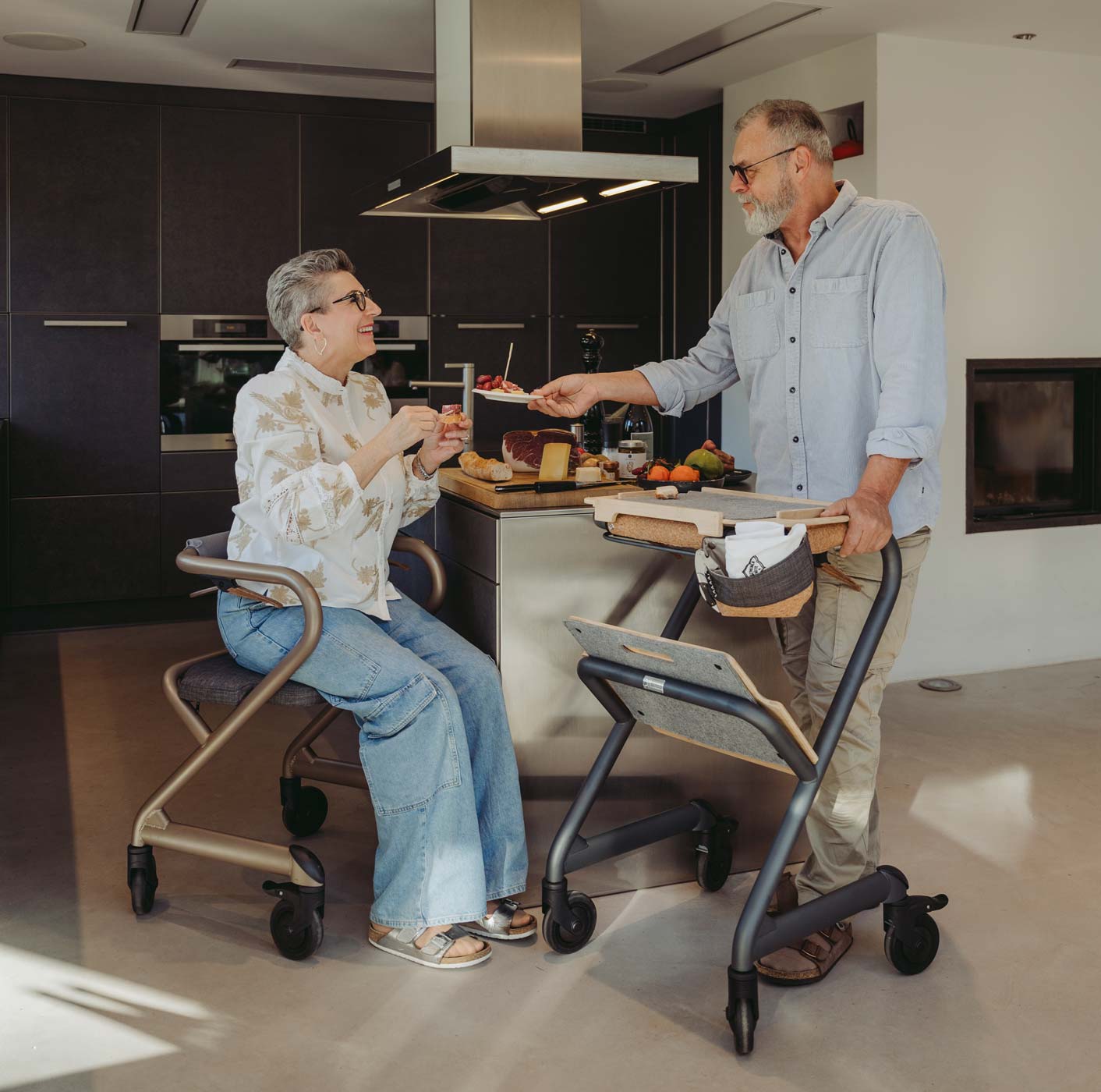 Als Stubenrollator ist er in den Farben Velvet Grey und Champagne Gold in 4 Sitzhöhen mit angepasster Griffhöhe verfügbar. Seine Gesamtbreite von 56 cm bietet bequemen Platz bei Laufpausen und einem Plausch.