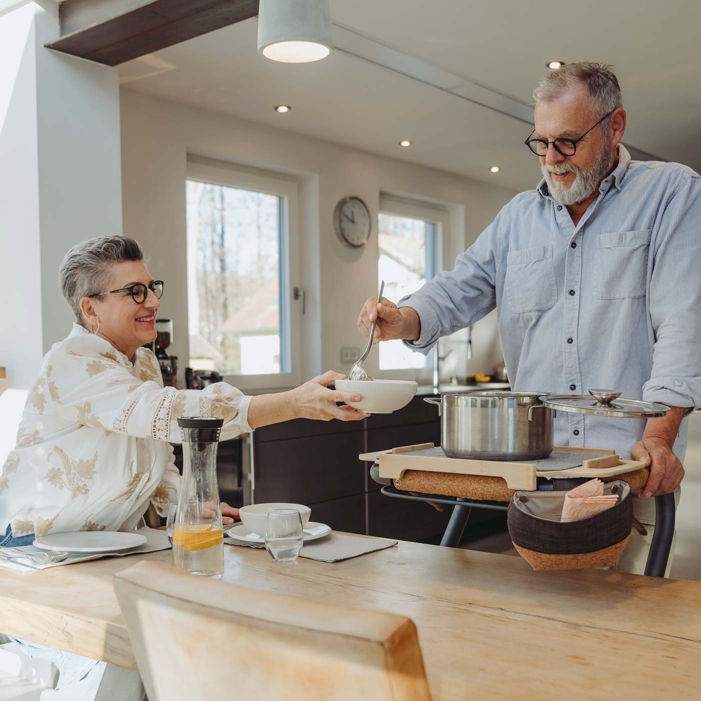 Möchten Sie mit Ihrer Familie zusammen am Tisch sitzen, dann nutzen Sie Ihren Saljol Wohnraumrollator als Sitzgelegenheit. Die tiefe Sitzfläche lässt Sie sicher sitzen und entspannen. Der durchgängige Handlauf bietet Ihnen zusätzliche Sicherheit bei Gleichgewichtsstörungen.