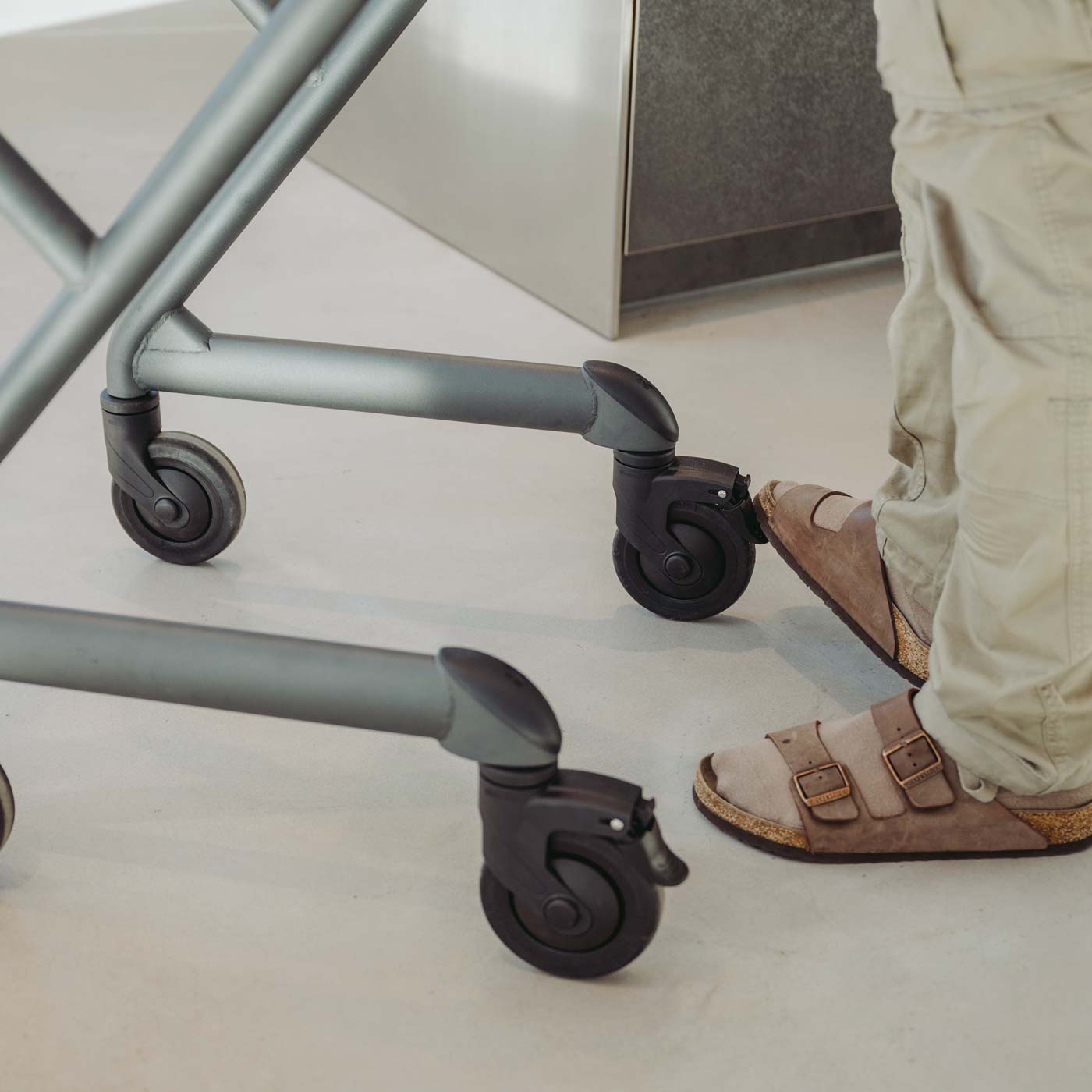 Die Hinterräder verfügen jeweils über einen Richtungsfeststeller in der ersten Einrastung. Drücken Sie mit den Füßen den Feststeller auf die zweite Einrastung, ist die Fußbremse des Wohnraumrollator WR aktiv und Sie können ihn zum Stützen z.B. als Aufstehhilfe von der Toilette nutzen, um wieder sicher aufzustehen.