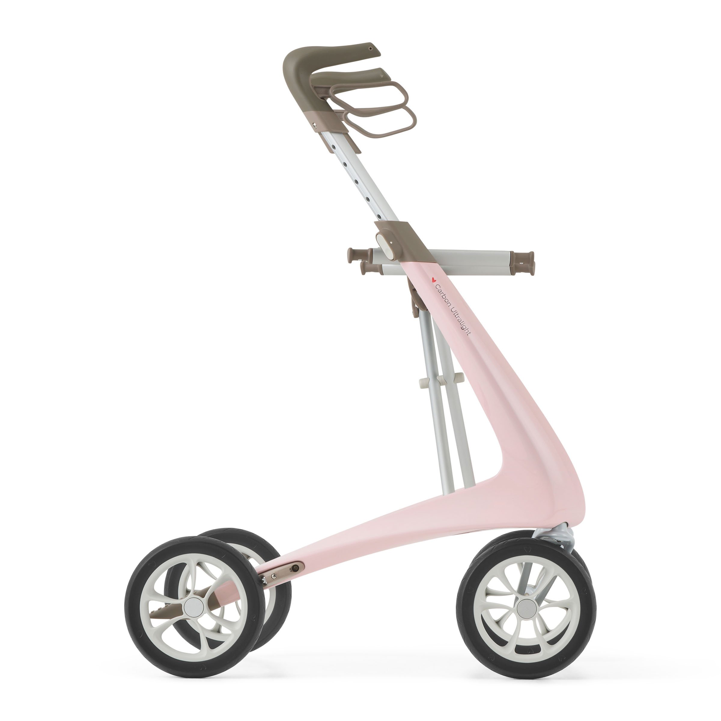- Der superleichte Hightech-Werkstoff Carbon in den Farben erdbeerrot, rosa, morning blue, champagner, perlweiß, schwarz, dunkelgrün oder königsblau ist neben der Rahmenform die auffälligste Eigenschaft der mobilen High End Gehhilfe.