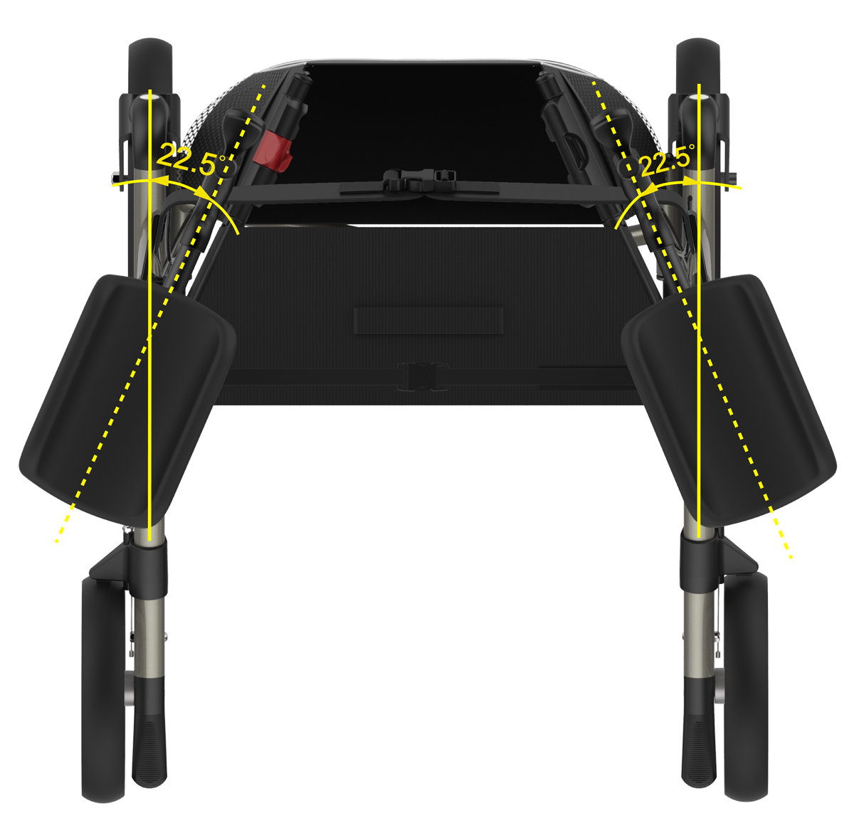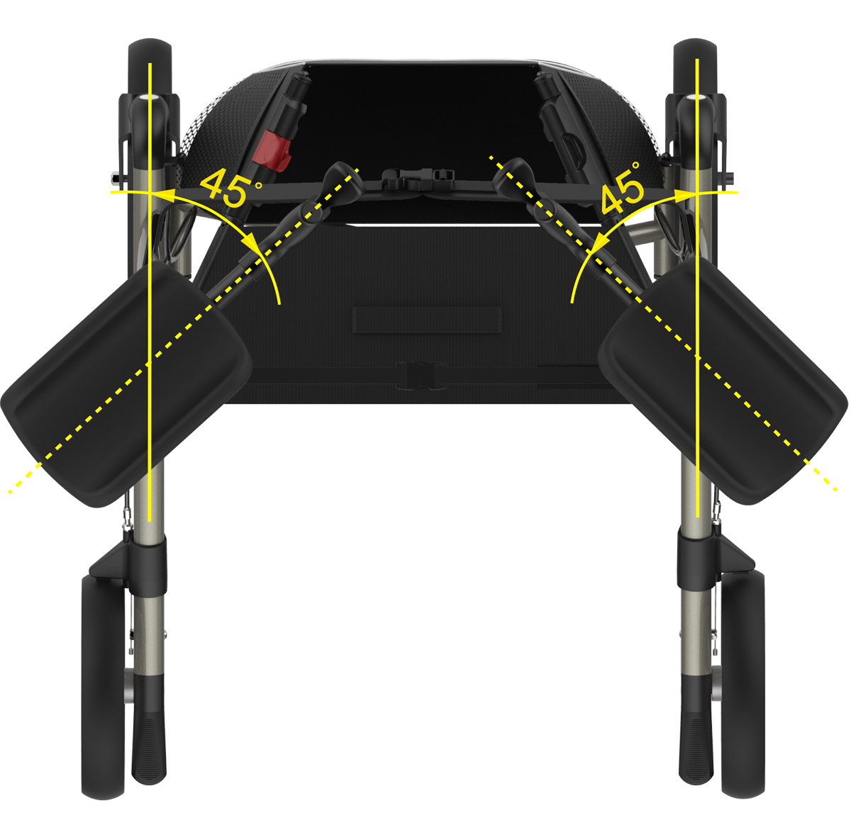- Die seitlich horizontal in einem Winkel von 22,5 Grad oder 45 Grad justierbaren Unterarmauflagen.