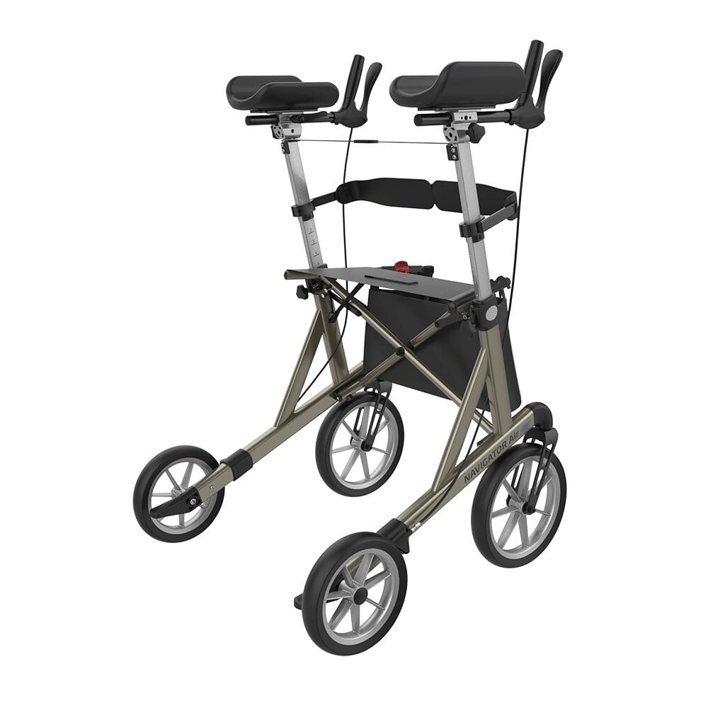 Der Arthritisrollator Navigator AIR von Rehasense ist ein Outdoor Rollator mit Unterarmauflagen und großen, weichen Rädern für Ihre Aktivitäten draußen abseits normaler Wege. Der einzigartige champagnerfarbene Rollator Navigator Air ist eine mobile Gehhilfe mit Unterarmauflagen, die speziell für Benutzer mit Arthritis und/oder eingeschränkter Funktion der Arme und Hände entwickelt wurde.