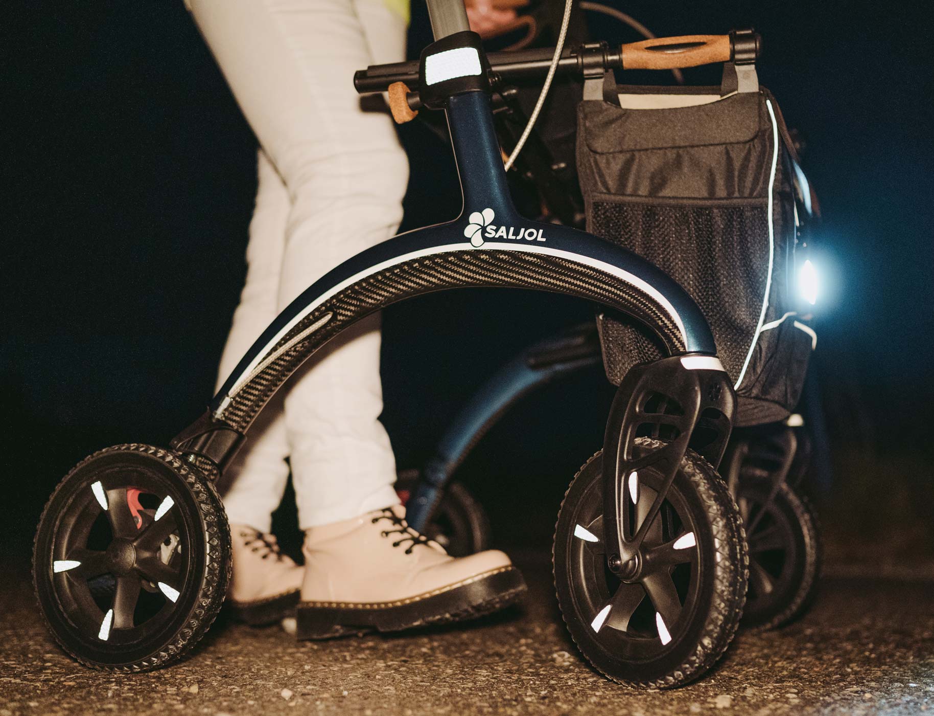Mit seinen 30 Reflektor-Punkten am Rahmen, den Reifen, an den Griffen, an beiden Ankipphilfen und der Tasche wird der Saljol Carbon als mobile Gehhilfe im Straßenverkehr bei Dunkelheit aus jeder Richtung wahrgenommen.