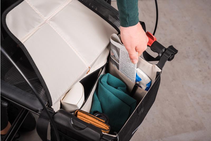 Die Einhand-Henkeltasche an den Befestigungsstangen ist hochwertig verarbeitet und besitzt oben auf der Abdeckung ein durchsichtiges Fach für Ihr Smartphone. So haben Sie Ihr Navigationssystem immer griffbereit. Die braune Kunstlederklappe schließt mit einem Magneten und erlaubt die Bedienung mit einer Hand, während sich die andere sicher auf dem Korkhandgriff des Rollators aufstützt. Der matt schwarze Saljol Carbon Rollator wird mit einer schwarzen Stoff-Einkaufstasche mit Magnetverschluss geliefert. An den Seiten finden Sie Netze für Getränke oder Ihre Zeitung. Innen ist die Tasche hell und mit drei weiteren Fächern zum Organisieren und Einkaufen ausgestattet. Stecken Sie die Henkel während der Fahrt in die Tasche und Sie haben einen idealen Schutz vor Taschendieben.