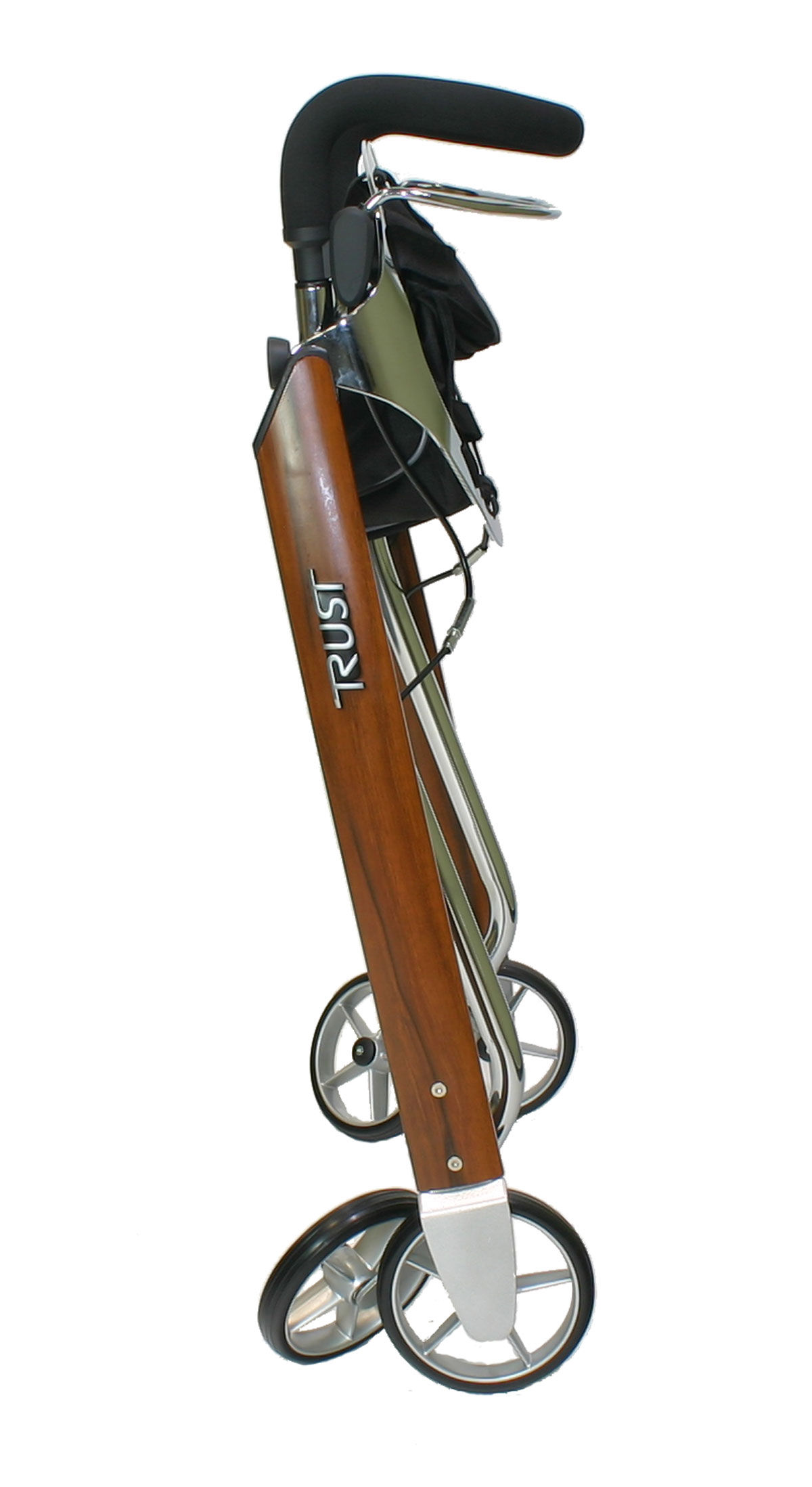 Lieferbar als eleganter Trust Care Indoor Rollator für die Wohnung bietet der Lets dream walnuss in Holzoptik und Chrom mit schwarzer Tasche und Tablett Sicherheit und Komfort beim Erhalt Ihrer Eigenständigkeit.