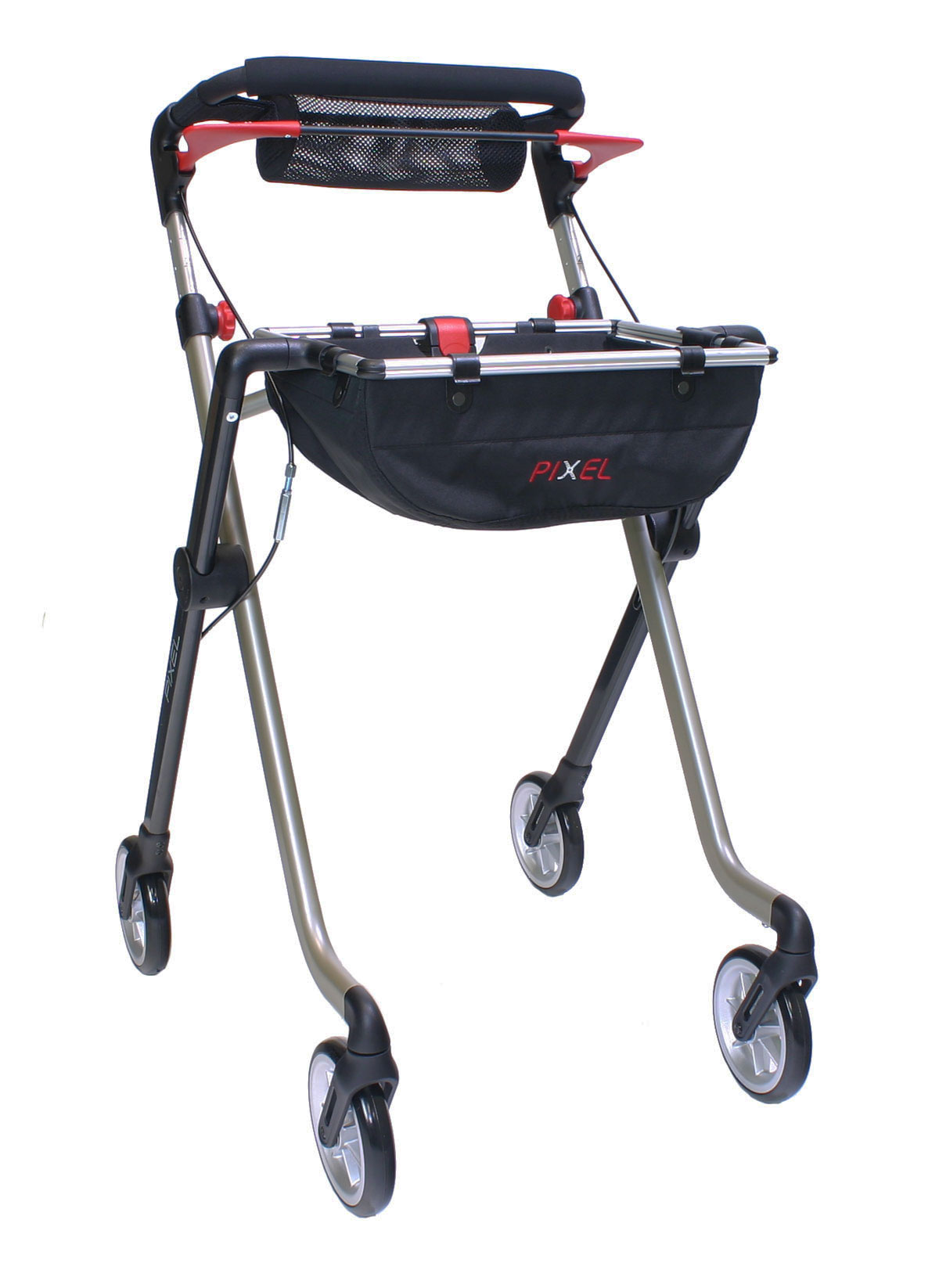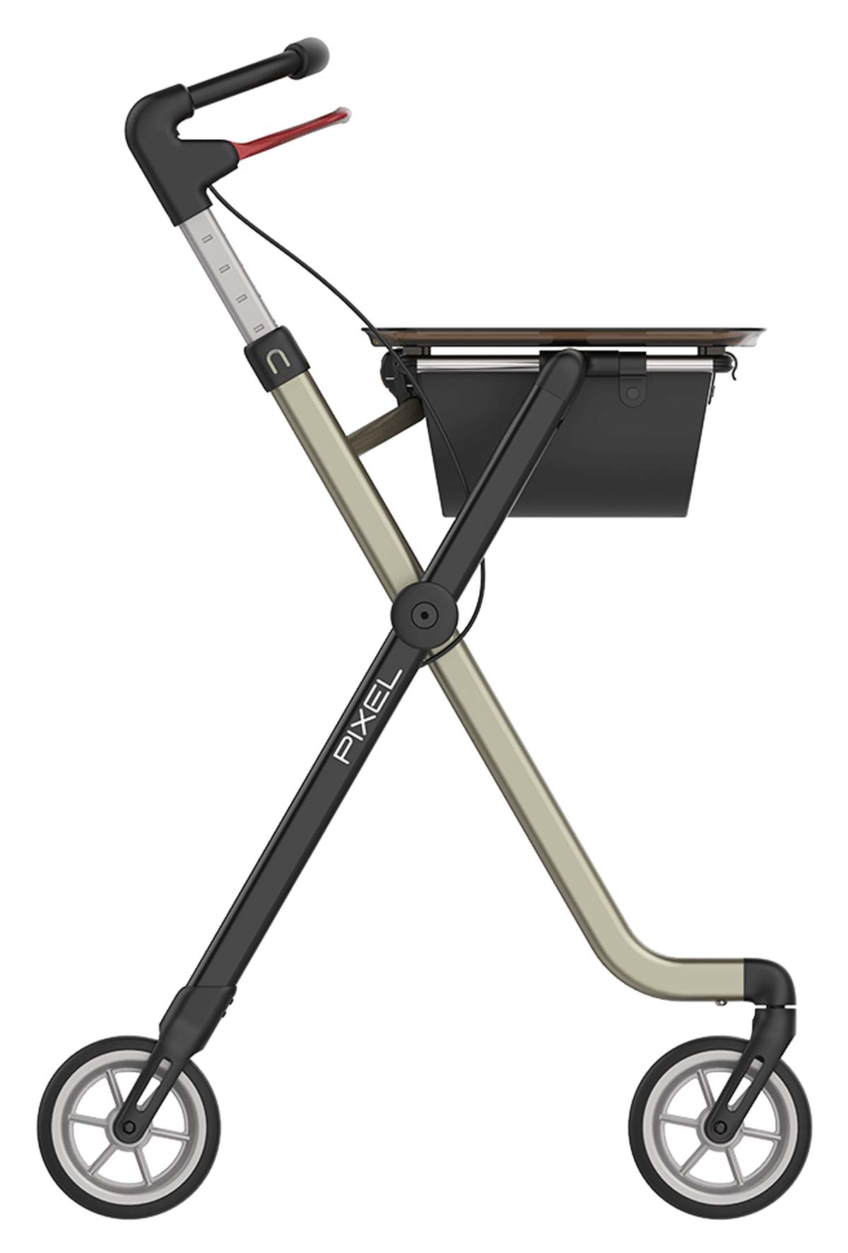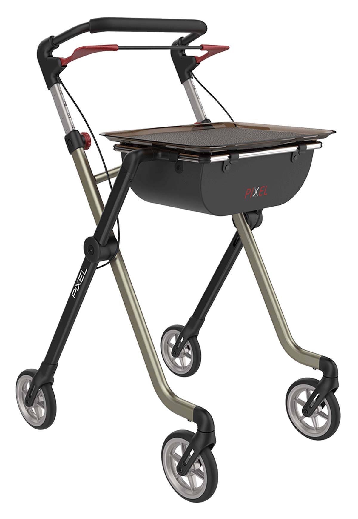 Mit dem schmalen Indoor Rollator Pixel bringen Sie wieder Selbstständigkeit und Unabhängigkeit in Ihren häuslichen Alltag. Der praktische Stubenrollator verfügt über den patentierten Click & Safe Verschluss, ist aus Aluminium gefertigt und lässt sich mit seinem quer faltbarem pulverbeschichteten Rahmen leicht und einfach aufbewahren oder transportieren. Als Zimmerrollator ist er wendig und stabil, kann optional mit einem bzw. zwei Stockhaltern und einer Antirutschmatte auf dem Tablett ausgestattet werden. Sein mit Moosgummi bezogener, gepolsterter Schiebegriff ist ein durchgehender Einhandgriff mit Bremsbügel und lässt sich in der Griffhöhe von 86 bis 97 cm einstellen.