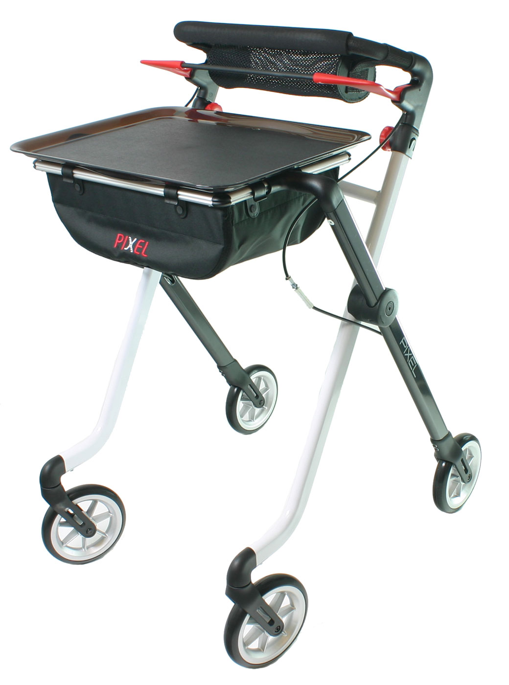 Mit dem schmalen Indoor Rollator Pixel bringen Sie wieder Selbstständigkeit und Unabhängigkeit in Ihren häuslichen Alltag. Der praktische Stubenrollator verfügt über den patentierten Click & Safe Verschluss, ist aus Aluminium gefertigt und lässt sich mit seinem quer faltbarem pulverbeschichteten Rahmen leicht und einfach aufbewahren oder transportieren. Als Zimmerrollator ist er wendig und stabil, kann optional mit einem bzw. zwei Stockhaltern und einer Antirutschmatte auf dem Tablett ausgestattet werden. Sein mit Moosgummi bezogener, gepolsterter Schiebegriff ist ein durchgehender Einhandgriff mit Bremsbügel und lässt sich in der Griffhöhe von 86 bis 97 cm einstellen.