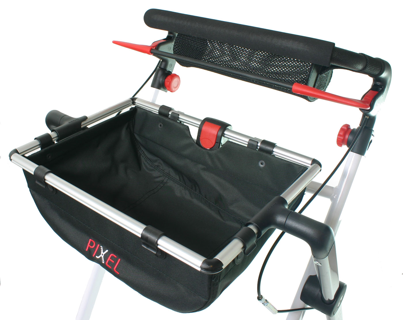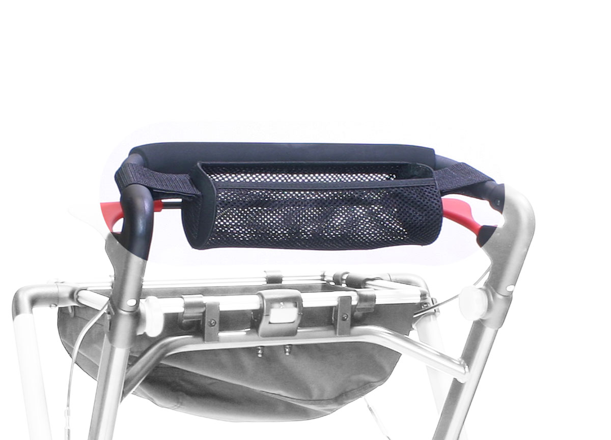 Zum einfachen Verstauen und schnellem Greifen bietet Rehasense für den Indoor Rollator Pixel eine kleine offene Netztasche, die auf Höhe des Griffes befestigt wird an. Hier passt Ihre Brille, das Handy oder die Fernbedienung gut rein und lässt sich ohne Mühe einfach wieder schnell entnehmen.
