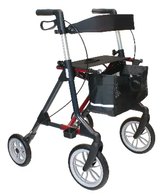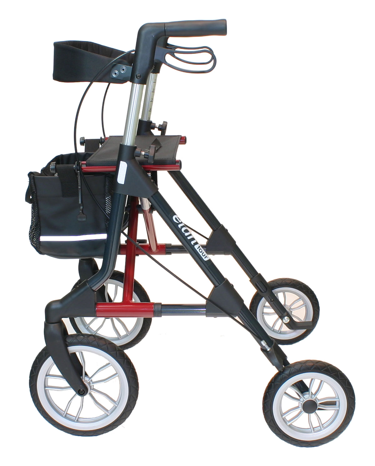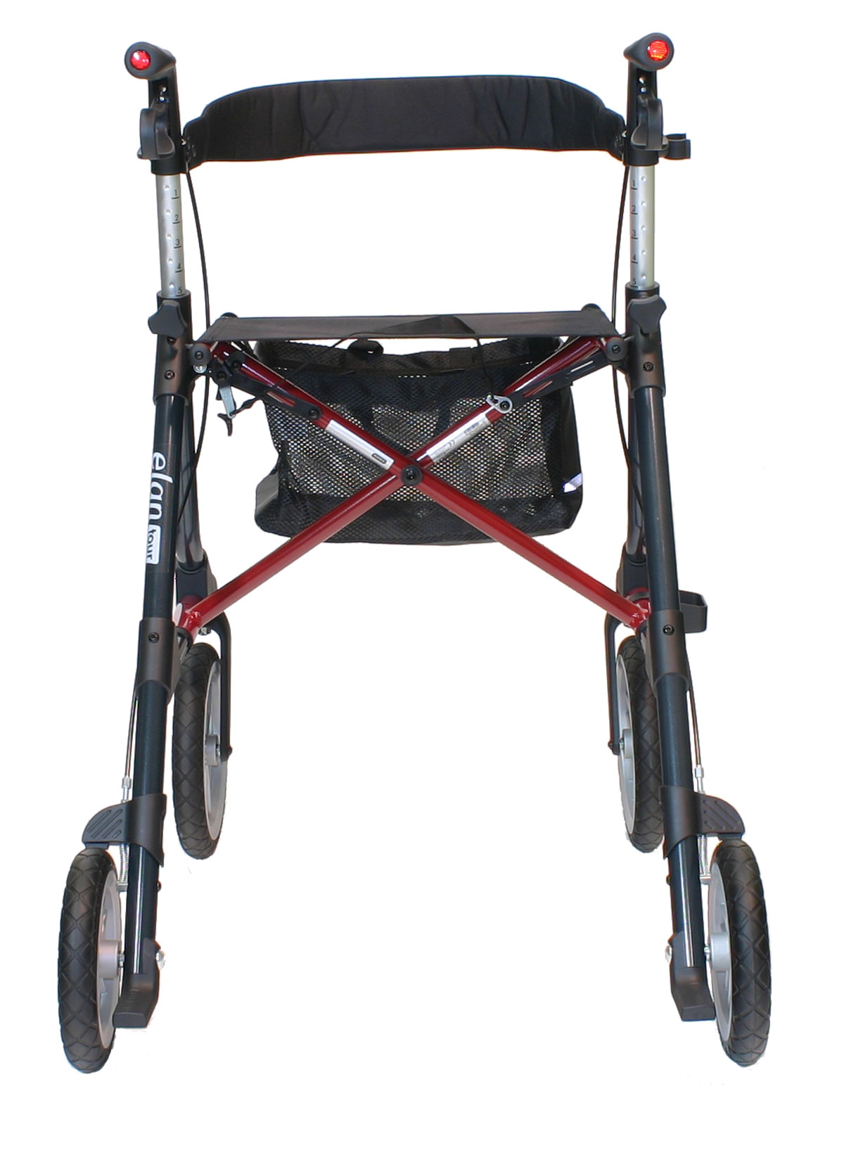 - Ein Leichtgewicht Rollator Russka Elan Tour in den Rahmenfarben champagner oder anthrazit mit dunkelroter Kreuzstrebe inklusive Rückengurt, Einkaufsnetz und Stockhalter
