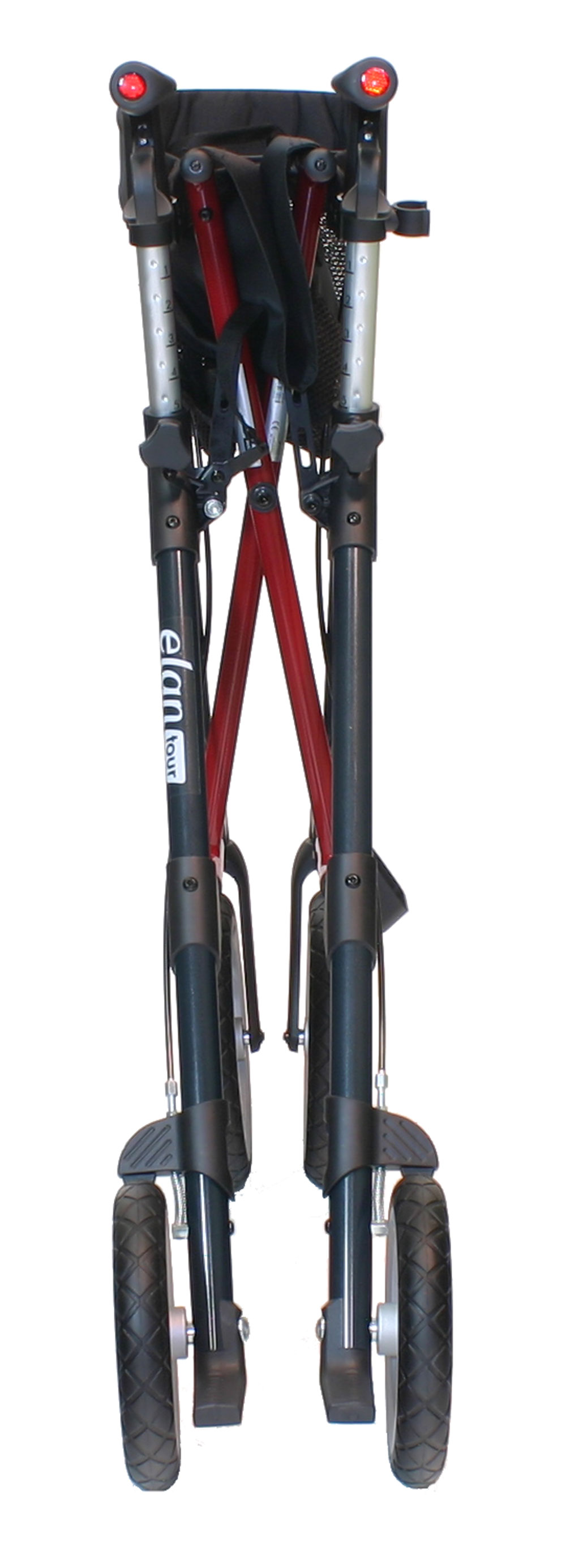 - Damit der Russka Rollator Elan Tour sich beim Anheben nicht ungewollt auseinanderfaltet, besitzt er einen an den Befestigungsstangen des Einkaufsnetzes integrierten Sicherheitsbügel. Diese Verrieglung hält den Rollator im gefalteten Zustand sicher zusammen. Nun steht Ihnen Ihr Outdoor Rollator von Russka schmal längs gefaltet als leicht schiebende Gehhilfe zur Verfügung.
